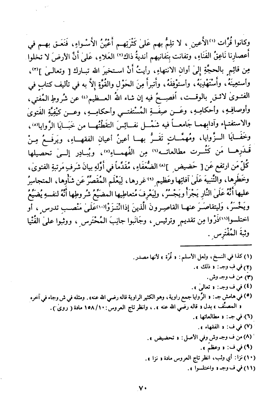 وكانوا قرات١ الأعين، لا تلم بهم على كثرتهم أعين الأسواء، فنعق بهم في أعصارنا ناعق الفناء، وتفانت بتفانيهم أندية ذاك٢ العلاء، على أن الأرض لا تخلوا من قائم بالحجة إلى أوان الانتهاء، رأيت أن أستخير الله تبارك "وتعالى"٣، وأستعينه، وأستهديه، وأستوقفه، وأتبرأ من الحول والقوة إلا به في تأليف كتاب في الفتوى لائق بالوقت، أفصح فيه إن شاء الله العظيم٤ عن شروط المفتي، وأوصافه، وأحكامه، وعن صفة المستفتي وأحكامه، وعن كيفية الفتوى والاسفتاء وآدابهما جامعًا فيه شمل نفائس التقطتها من خبايا الروايا٥، وخفايا الزوايا، ومهمات تقر بها أعين أعيان الفقهاء، ويرفع من قدرها من كثرت مطالعاته٦ من الفهماء٧، ويبادر إلى تحصيلها كل من ارتفع عن "حضيض"٨ الضعفاء، مقدمًا في أوله بيان شرف مرتبة الفتوى، وخطرها، والتنبيه على آفاتها وعظيم٩ غررها، ليعلم المقصر عن شأوها، المتجاسر عليها أنه على النار يجرأ ويجسر، وليعرف متعاطيها المضيع شروطها أنه لنفسه يضيع ويخسر، وليتقاصر عنها القاصرون الذين إذا انتزوا١٠ على منصب تدرس، أو اختلسوا١١ ذروا من تقديم وترئيس، وجانبوا جانب المحترس، ووثبوا على الفتيا وثبة المفترس.