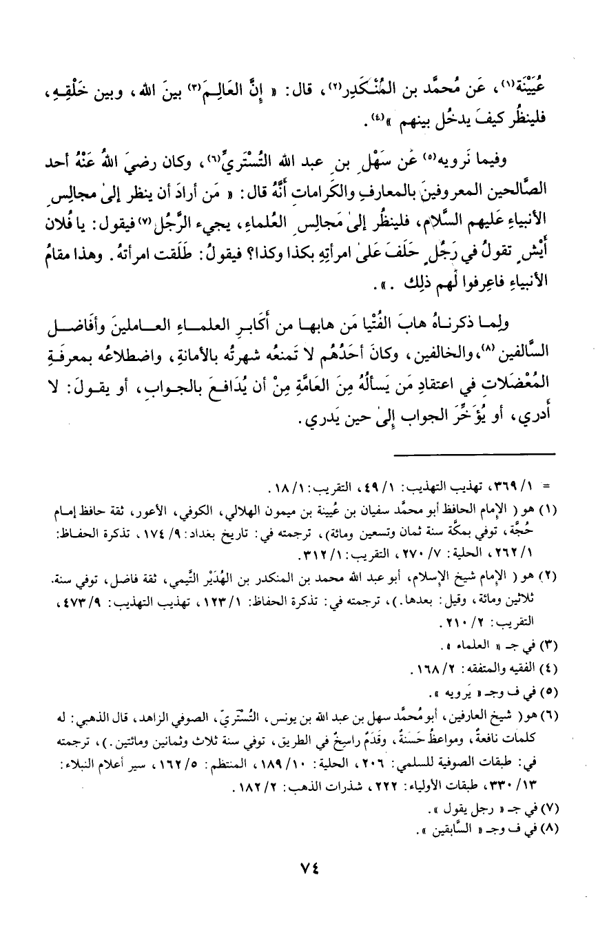وفيما نرويه٥ عن سهل بن عبد الله التستري٦، وكان رضي الله عنه أحد الصالحين المعروفين بالمعارف والكرامات أنه قال: "من أراد أن ينظر إلى مجالس الأنبياء عليهم السلام، فلينظر إلى مجالس العلماء، يجيء الرجل٧ فيقول: يا فلان أيش تقول في رجل حلف على امرأته بكذا وكذا؟ فيقول: طلقت امرأته, وهذا مقام الأنبياء فاعرفوا لهم ذلك ... ".