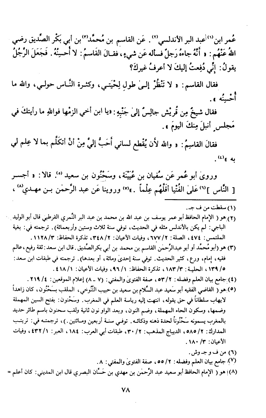 عمر ابن١ عبد البر الأندلسي٢, عن القاسم بن محمد٣ بن أبي بكر الصديق رضي الله عنهم: "أنه جاءه رجل فسأله عن شيء، فقال القاسم: لا أحسنه. فجعل الرجل يقول: إني دفعت إليك لا أعرف غيرك؟