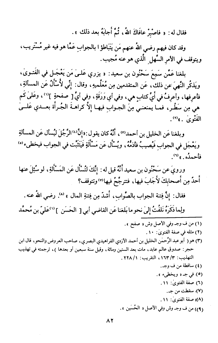 وروي عن سحنون بن سعيد أنه قيل له: "إنك لتسأل عن المسألة، لو سئل عنها أحد من أصحابك لأجاب فيها، فتترجَّح فيها٧ وتتوقف؟