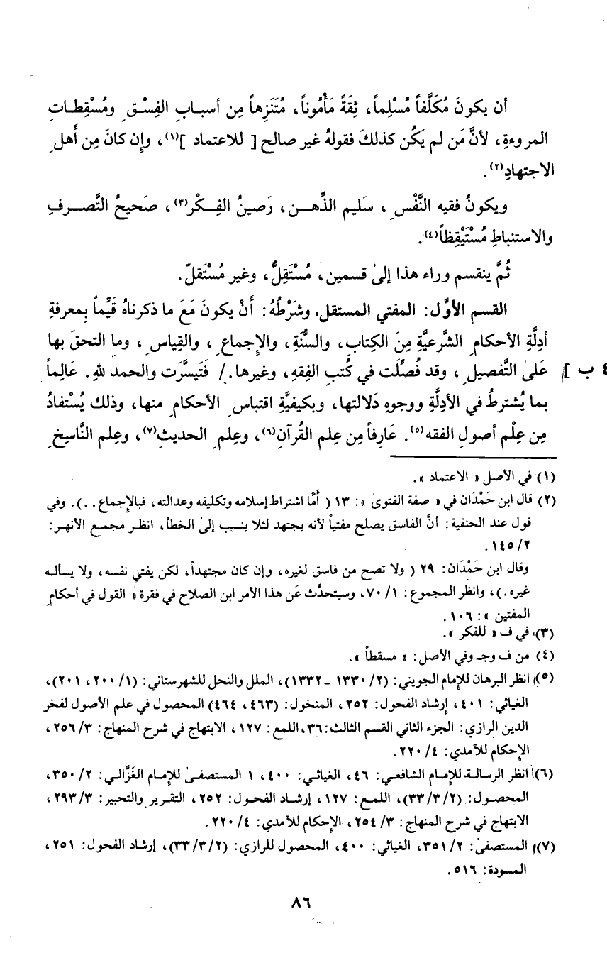 القسم الأول: المفتي المستقل، وشرطه: أن يكون مع ما ذكرناه قيمًا بمعرفة أدلة الأحكام الشرعية من الكتاب، والسنة، والإجماع، والقياس، وما التحق بها على التفصيل، وقد فصلت في كتب الفقه، وغيرها. فتيسرت والحمد لله. عالمًا بما يشترط في الأدلة ووجوه دلالتها، وبكيفية اقتباس الأحكام منها، وذلك يستفاد من علم أصول الفقه٥، عارفًا من علم القرآن٦، وعلم الحديث٧، وعلم الناسخ