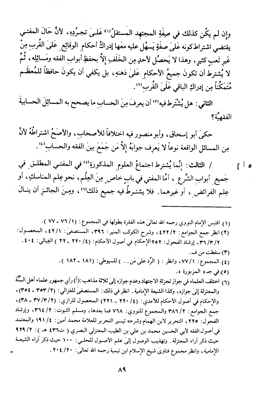 الثالث: إنما يشترط اجتماع العلوم المذكورة٥ في المفتي المطلق في جميع أبواب الشرع، أما المفتي في باب خاص من العلم، نحو علم المناسك، أو علم الفرائض، أو غيرهما، فلا يشترط فيه جميع ذلك٦، ومن الجائز أن ينال