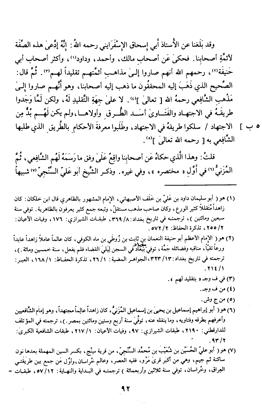 وقد بلغنا عن الأستاذ أبي إسحاق الإسفراييني رحمه الله: إنه ادعى هذه الصفة لأئمة أصحابنا, فحكى عن أصحاب مالك، وأحمد، وداود١، وأكثر أصحاب أبي حنيفة٢، رحمهم الله أنهم صاروا إلى مذاهب أئمتهم تقليدًا لهم٣. ثم قال: الصحيح الذي ذهب إليه المحققون ما ذهب إليه أصحابنا، وهو أنهم صاروا إلى مذهب الشافعي رحمه الله "تعالى"٤, لا على جهة التقليد له، ولكن لما وجدوا طريقه في الاجتهاد والفتاوى أسد الطرق، وأولاها، ولم يكن لهم بد من الاجتهاد سلكوا طريقه في الاجتهاد، وطلبوا معرفة الأحكام بالطريق الذي طلبها الشافعي به "رحمه الله تعالى"٥.