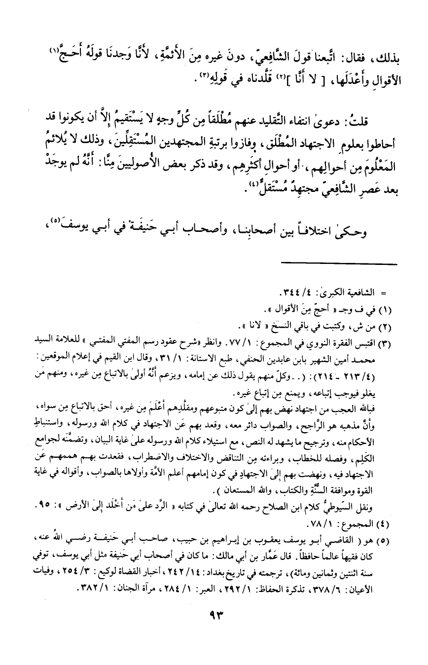 ٣ اقتبس الفقرة النووي في المجموع: ١/ ٧٧، وانظر "شرح عقود رسم المفتي المفتي" للعلامة السيد محمد أمين الشهير بابن عبدون الحنفي، طبع الأستانة: ١/ ٣١، وقال ابن القيم في إعلام الموقعين: "٤/ ٢١٣-٢١٤": " ... وكل منهم يقول ذلك عن إمامه، ويزعم أنه أولى بالاتباع من غيره، ومنهم من يغلو فيوجب اتباعه، ويمنع من اتباع غيره.