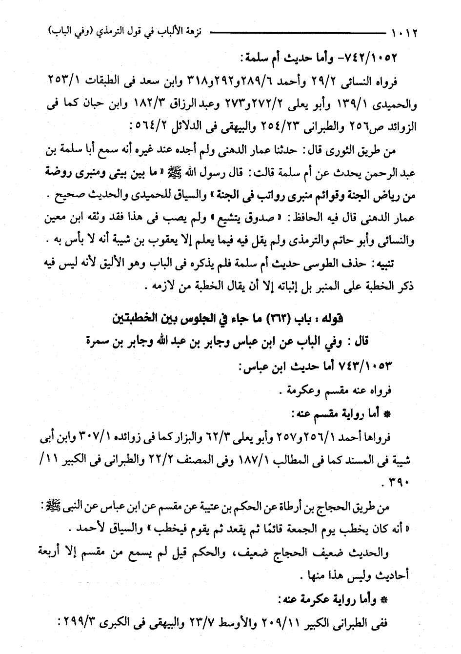 تنبيه: حذف الطوسى حديث أم سلمة فلم يذكره في الباب وهو الأليق لأنه ليس فيه ذكر الخطبة على المنبر بل إثباته إلا أن يقال الخطبة من لازمه.