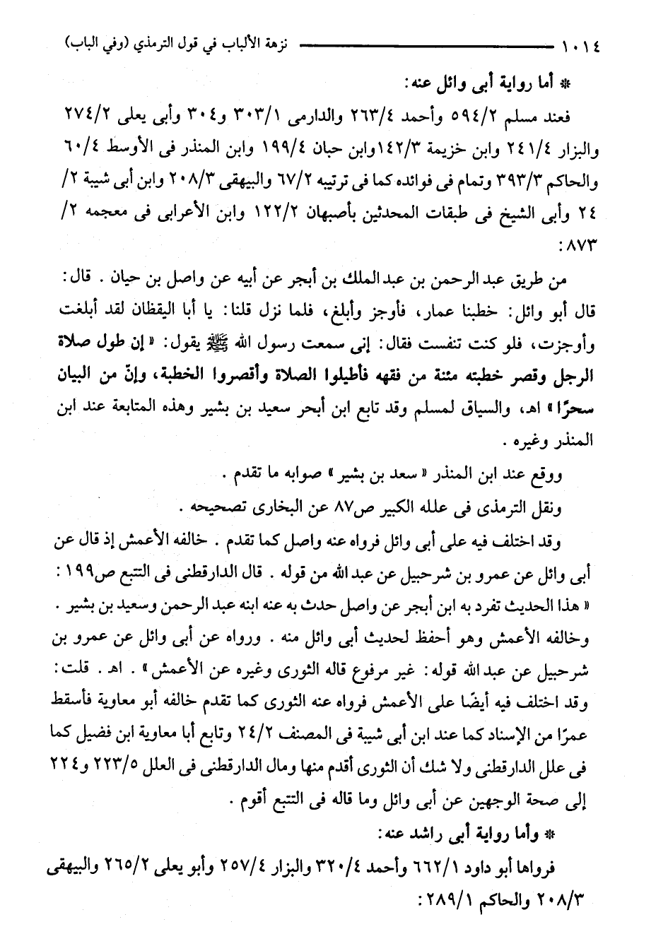من طريق عبد الرحمن بن عبد الملك بن أبجر عن أبيه عن واصل بن حيان. قال: قال أبو وائل: خطبنا عمار، فأوجز وأبلغ، فلما نزل قلنا: يا أبا اليقظان لقد أبلغت وأوجزت، فلو كنت تنفست فقال: إنى سمعت رسول الله - صلى الله عليه وسلم - يقول: "إن طول صلاة الرجل وقصر خطبته مئنة من فقهه فأطيلوا الصلاة وأقصروا الخطبة، وإن من البيان سحرًا" اهـ، والسياق لمسلم وقد تابع ابن أبحر سعيد بن بشير وهذه المتابعة عند ابن المنذر وغيره.