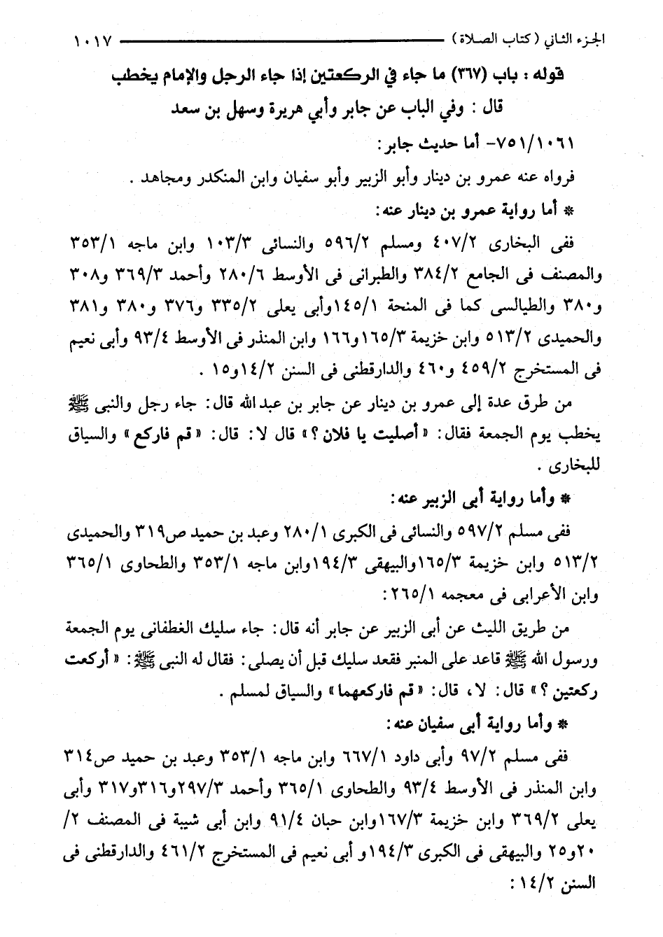 من طريق الليث عن أبى الزبير عن جابر أنه قال: جاء سليك الغطفانى يوم الجمعة ورسول الله - صلى الله عليه وسلم - قاعد على المنبر فقعد سليك قبل أن يصلى: فقال له النبي - صلى الله عليه وسلم -: " أركعت ركعتين؟ " قال: لا، قال: "قم فاركعهما" والسياق لمسلم.