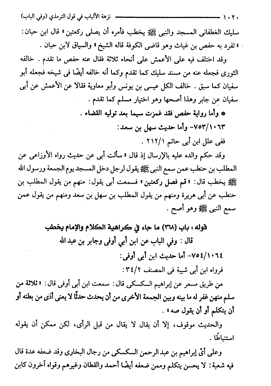 سليك الغطفانى المسجد والنبي - صلى الله عليه وسلم - يخطب فأمره أن يصلى ركعتين" قال ابن حبان: "تفرد به حفص بن غياث وهو قاضى الكوفة قاله الشيخ) والسياق لابن حبان.