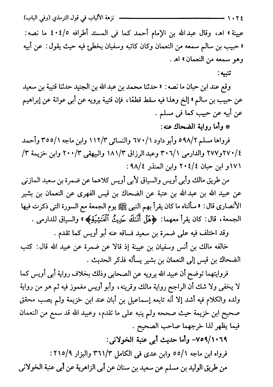 فروايتهما توضح أن عبيد الله يرويه عن الصحابي وذلك بخلاف رواية أبى أويس كما لايخفى ولا شك أن الراجح رواية مالك وقرينه، وأبو أويس مغموز فيه ثم هو من رواية ولده والكلام فيه أشد إلا أنه تابعه إسماعيل بن أبان عند ابن خزيمة ولم يصب محقق صحيح ابن خزيمة حيث صححه ولم ينبه على ما تقدم، وعبيد الله قد سمع من النعمان فيما يظهر لذا خرجهما صاحب الصحيح.