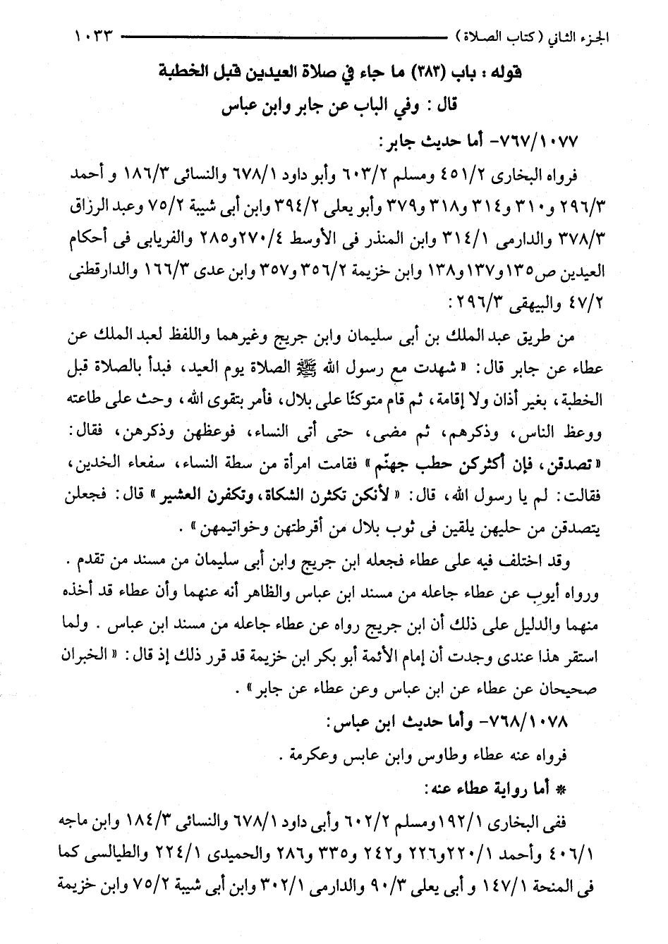 فرواه البخاري 2/ 451 ومسلم 2/ 603 وأبو داود 1/ 678 والنسائي 3/ 186 وأحمد 3/ 296 و 310 و 314 و 318 و 379 وأبو يعلى 2/ 394 وابن أبى شيبة 2/ 75 وعبد الرزاق 3/ 378 والدارمي 1/ 314 وابن المنذر في الأوسط 4/ 270 و 285 والفريابى في أحكام العيدين ص 135 و 137 و 138 وابن خزيمة 2/ 356 و 357 وابن عدى 3/ 166 والدارقطني 2/ 47 والبيهقي 3/ 296: