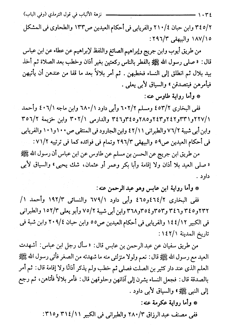 ففي البخاري 2/ 453 ومسلم 2/ 602 وأبى داود 1/ 680 وابن ماجه 1/ 406 وأحمد 1/ 227 و 331 و 242 و 243 و 285 و 345 و 346 والدارمي 1/ 302 وابن خزيمة 2/ 356 وابن أبى شيبة 2/ 76 والطبراني 11/ 42 وابن الجارود في المنتقى ص 100 و 101 والفريابى في أحكام العيدين ص 59 والبيهقي 3/ 296 وتمام في فوائده كما في ترتيبه 2/ 71: