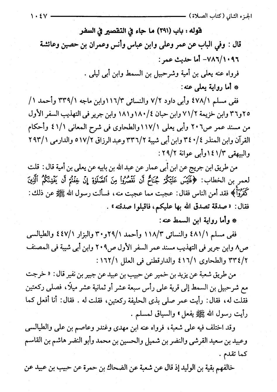 من طريق ابن جريج عن ابن أبى عمار عن عبد الله بن بابيه عن يعلى بن أمية قال: قلت لعمر بن الخطاب: {فَلَيْسَ عَلَيْكُمْ جُنَاحٌ أَنْ تَقْصُرُوا مِنَ الصَّلَاةِ إِنْ خِفْتُمْ أَنْ يَفْتِنَكُمُ الَّذِينَ كَفَرُوا} فقد أمن الناس فقال: عجبت مما عجبت منه، فسألت رسول الله - صلى الله عليه وسلم - عن ذلك: فقال: "صدقة تصدق الله بها عليكم، فاقبلوا صدقته".