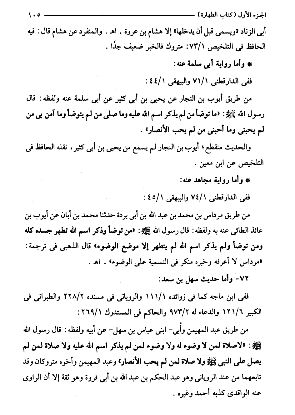 من طريق أيوب بن النجار عن يحيى بن أبى كثير عن أبى سلمة عنه ولفظه: قال رسول الله - صلى الله عليه وسلم -: "ما توضأ من لم يذكر اسم الله عليه وما صلى من لم يتوضأ وما آمن بى من لم يحبنى وما أحبنى من لم يحب الأنصار".