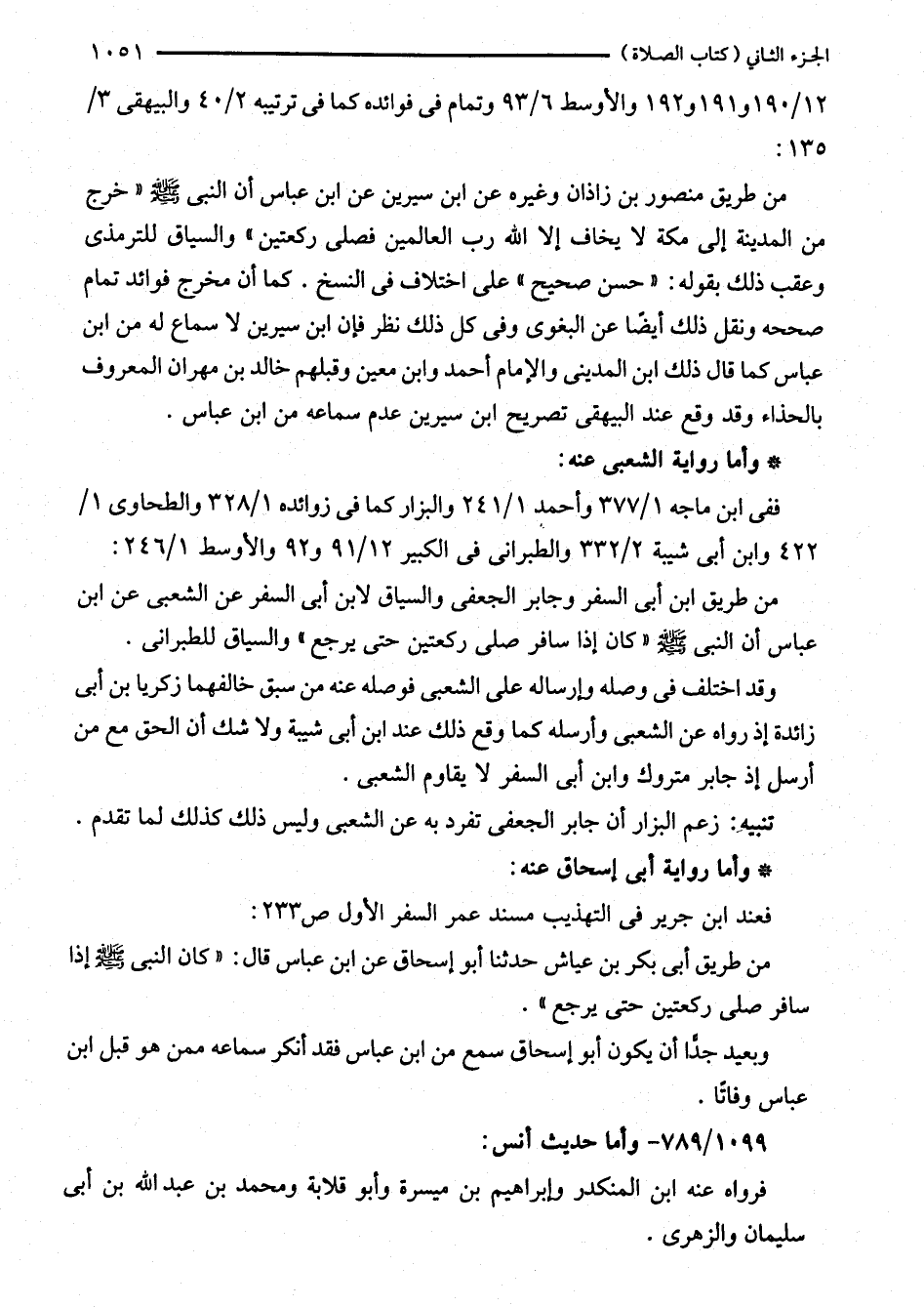 من طريق أبى بكر بن عياش حدثنا أبو إسحاق عن ابن عباس قال: "كان النبي - صلى الله عليه وسلم - إذا سافر صلى ركعتين حتى يرجع ".