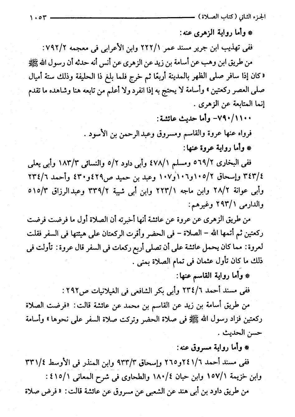من طريق أسامة بن زيد عن القاسم بن محمد عن عائشة قالت: "فرضت الصلاة ركعتين فزاد رسول الله - صلى الله عليه وسلم - في صلاة الحضر وتركت صلاة السفر على نحوها" وأسامة حسن الحديث.