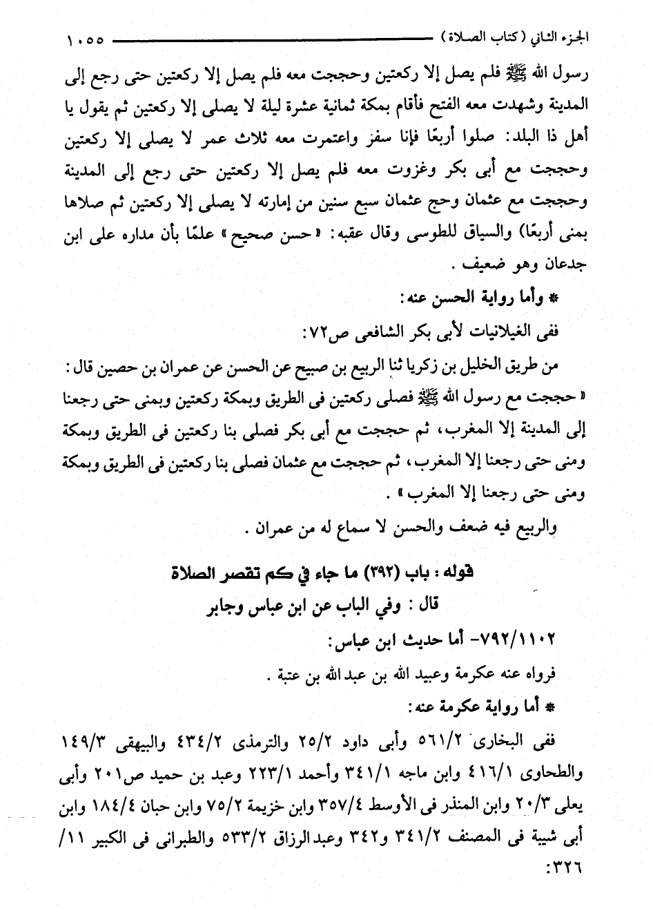رسول الله - صلى الله عليه وسلم - فلم يصل إلا ركعتين وحججت معه فلم يصل إلا ركعتين حتى رجع إلى المدينة وشهدت معه الفتح فأقام بمكة ثمانية عشرة ليلة لا يصلى إلا ركعتين ثم يقول يا أهل ذا البلد: صلوا أربعًا فإنا سفرَ واعتمرت معه ثلاث عمر لا يصلى إلا ركعتين وحججت مع أبى بكر وغزوت معه فلم يصل إلا ركعتين حتى رجع إلى المدينة وحججت مع عثمان وحج عثمان سبع سنين من إمارته لا يصلى إلا ركعتين ثم صلاها بمنى أربعًا) والسياق للطوسى وقال عقبه: "حسن صحيح" علمًا بأن مداره على ابن جدعان وهو ضعيف.