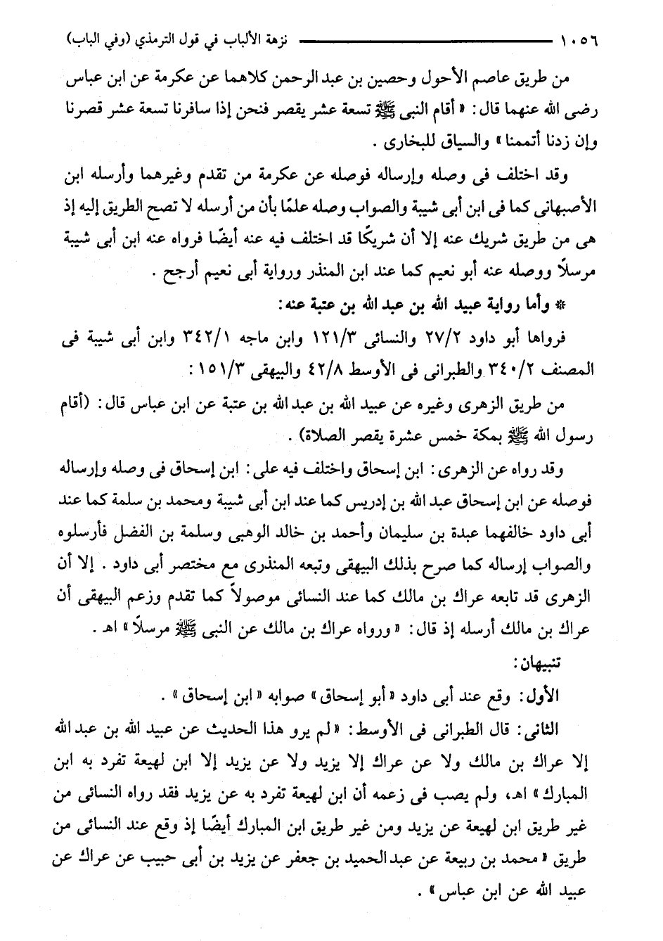 الثاني: قال الطبراني في الأوسط: "لم يرو هذا الحديث عن عبيد الله بن عبد الله إلا عراك بن مالك ولا عن عراك إلا يزيد ولا عن يزيد إلا ابن لهيعة تفرد به ابن المبارك" اهـ، ولم يصب في زعمه أن ابن لهيعة تفرد به عن يزيد فقد رواه النسائي من غير طريق ابن لهيعة عن يزيد ومن غير طريق ابن المبارك أيضًا إذ وقع عند النسائي من طريق "محمد بن ربيعة عن عبد الحميد بن جعفر عن يزيد بن أبي حبيب عن عراك عن عبيد الله عن ابن عباس".