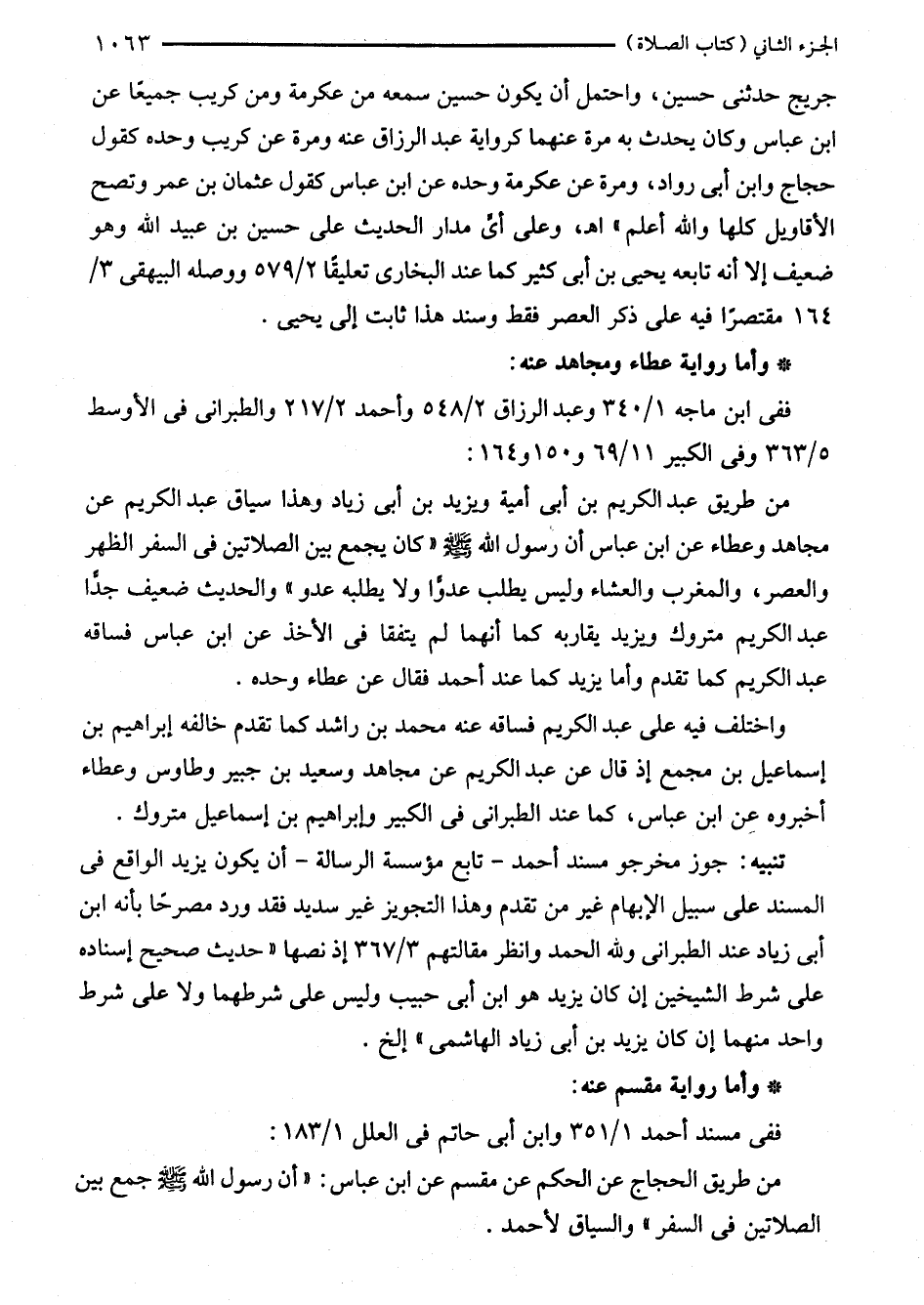 من طريق عبد الكريم بن أبي أمية ويزيد بن أبي زياد وهذا سياق عبد الكريم عن مجاهد وعطاء عن ابن عباس أن رسول الله - صلى الله عليه وسلم - "كان يجمع بين الصلاتين في السفر الظهر والعصر، والمغرب والعشاء وليس يطلب عدوًّا ولا يطلبه عدو" والحديث ضعيف جدًّا عبد الكريم متروك ويزيد يقاربه كما أنهما لم يتفقا في الأخذ عن ابن عباس فساقه عبد الكريم كما تقدم وأما يزيد كما عند أحمد فقال عن عطاء وحده.