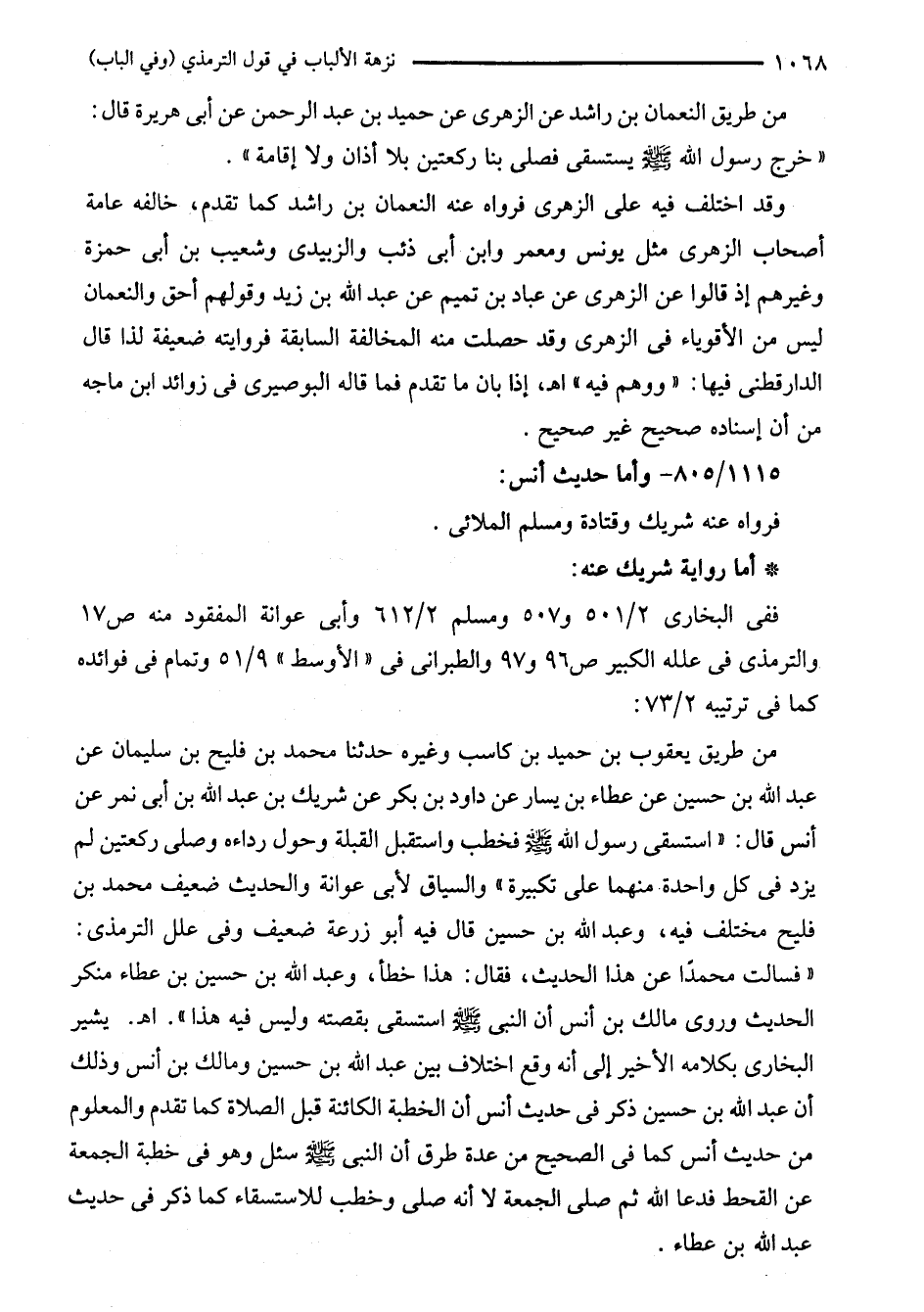 من طريق النعمان بن راشد عن الزهري عن حميد بن عبد الرحمن عن أبي هريرة قال: "خرج رسول الله - صلى الله عليه وسلم - يستسقى فصلى بنا ركعتين بلا أذان ولا إقامة".