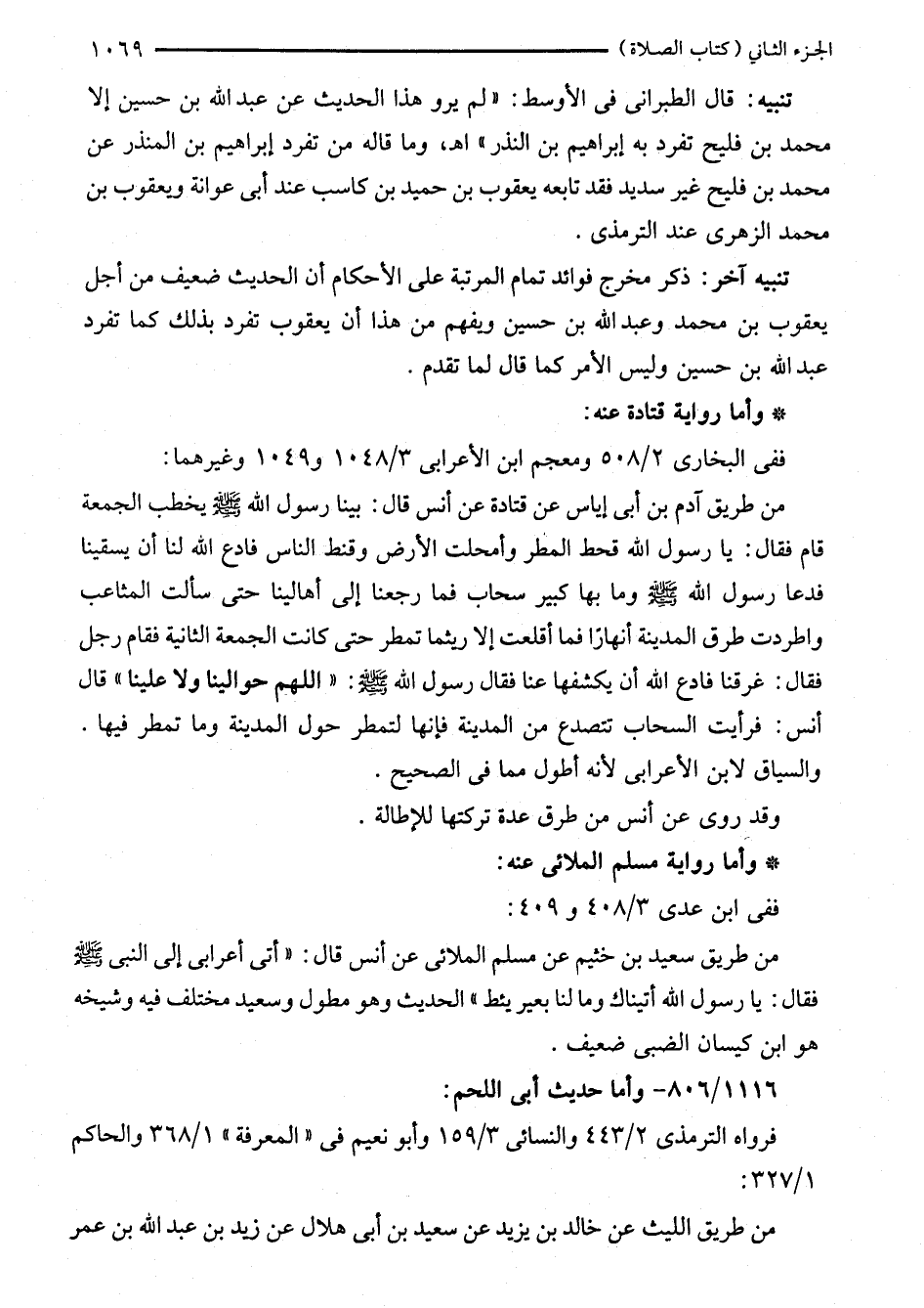 من طريق آدم بن أبي إياس عن قتادة عن أنس قال: بينا رسول الله - صلى الله عليه وسلم - يخطب الجمعة قام فقال: يا رسول الله قحط المطر وأمحلت الأرض وقنط الناس فادع الله لنا أن يسقينا فدعا رسول الله - صلى الله عليه وسلم - وما بها كبير سحاب فما رجعنا إلى أهالينا حتى سألت المثاعب واطردت طرق المدينة أنهارًا فما أقلعت إلا ريثما تمطر حتى كانت الجمعة الثانية فقام رجل فقال: غرقنا فادع الله أن يكشفها عنا فقال رسول الله - صلى الله عليه وسلم -: "اللهم حوالينا ولا علينا" قال أنس: فرأيت السحاب تتصدع من المدينة فإنها لتمطر حول المدينة وما تمطر فيها. والسياق لابن الأعرابي لأنه أطول مما في الصحيح.