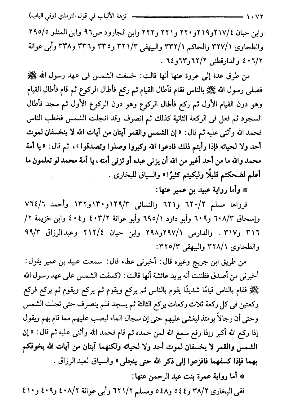 من طرق عدة إلى عروة عنها أنها قالت: خسفت الشمس في عهد رسول الله - صلى الله عليه وسلم - فصلى رسول الله - صلى الله عليه وسلم - بالناس فقام فأطال القيام ثم ركع فأطال الركوع ثم قام فأطال القيام وهو دون القيام الأول ثم ركع فأطال الركوع وهو دون الركوع الأول ثم سجد فأطال السجود ثم فعل في الركعة الثانية كذلك ثم انصرف وقد انجلت الشمس فخطب الناس فحمد الله وأثنى عليه ثم قال: "إن الشمس والقمر آيتان من آيات الله لا ينخسفان لموت أحد ولا لحياته فإذا رأيتم ذلك فادعوا الله وكبروا وصلوا وتصدقوا"، ثم قال: "يا أمة محمد والله ما من أحد أغير من الله أن يزنى عبده أو تزنى أمته، يا أمة محمد لو تعلمون ما أعلم لضحكتم قليلاً ولبكيتم كثيرًا" والسياق للبخاري.