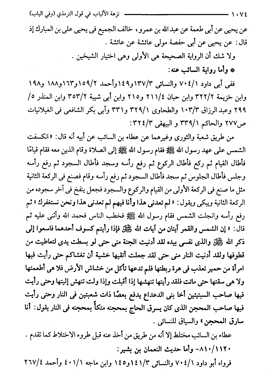 من طريق شعبة والثورى وغيرهما عن عطاء بن السائب عن أبيه أنه قال: "انكسفت الشمس على عهد رسول الله - صلى الله عليه وسلم - فقام رسول الله - صلى الله عليه وسلم - إلى الصلاة وقام الذين معه فقام قيامًا فأطال القيام ثم ركع فأطال الركوع ثم رفع رأسه وسجد فأطال السجود ثم رفع رأسه وجلس فأطال الجلوس ثم سجد فأطال السجود ثم رفع رأسه وقام فصنع في الركعة الثانية مثل ما صنع في الركعة الأولى من القيام والركوع والسجود فجعل ينفخ في آخر سجوده من الركعة الثانية ويبكى ويقول: "لم تعدنى هدا وأنا فيهم لم تعدنى هذا ونحن نستغفرك" ثم رفع رأسه وانجلت الشمس فقام رسول الله - صلى الله عليه وسلم - فخطب الناس فحمد الله وأثنى عليه ثم قال: "إن الشمس والقمر آيتان من آيات الله - عز وجل - فإذا رأيتم كسوف أحدهما فاسعوا إلى ذكر الله - عز وجل - والذي نفسى بيده لقد أدنيت الجنة منى حتى لو بسطت يدى لتعاطيت من قطوفها ولقد أدنيت النار منى حتى لقد جعلت أتقيها خشية أن تغشاكم حتى رأيت فيها امرأة من حمير تعذب في هرة ربطتها فلم تدعها تأكل من خشاش الأرض فلا هي أطعمتها ولا هي سقتها حتى ماتت فلقد رأيتها تنهشها إذا أقبلت وإذا ولت تنهش إليتها وحتى رأيت