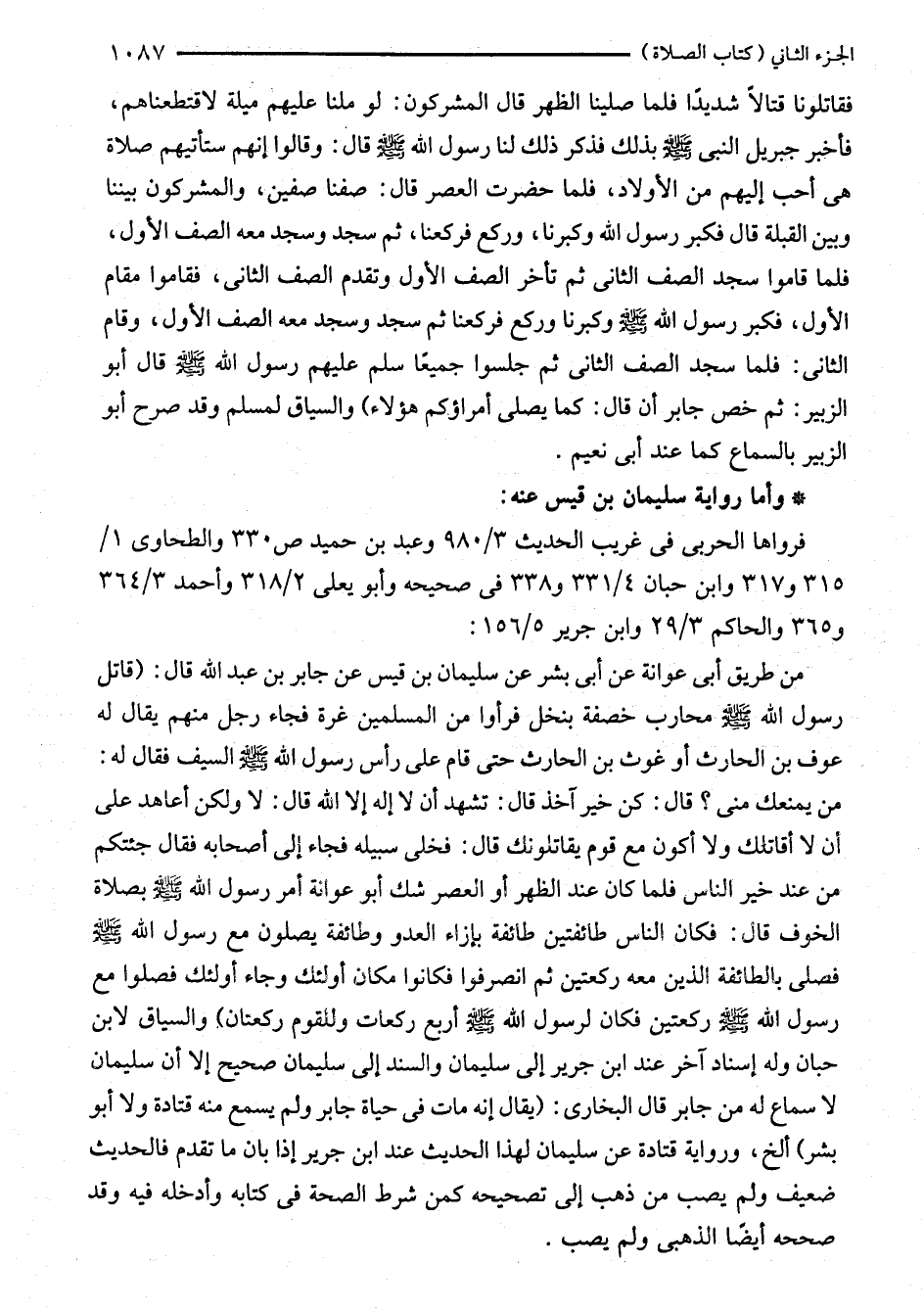 من طريق أبي عوانة عن أبي بشر عن سليمان بن قيس عن جابر بن عبد الله قال: (قاتل رسول الله - صلى الله عليه وسلم - محارب خصفة بنخل فرأوا من المسلمين غرة فجاء رجل منهم يقال له عوف بن الحارث أو غوث بن الحارث حتى قام على رأس رسول الله - صلى الله عليه وسلم - السيف فقال له: من يمنعك مني؟ قال: كن خير آخذ قال: تشهد أن لا إله إلا الله قال: لا ولكن أعاهد على أن لا أقاتلك ولا أكون مع قوم يقاتلونك قال: فخلى سبيله فجاء إلى أصحابه فقال جئتكم من عند خير الناس فلما كان عند الظهر أو العصر شك أبو عوانة أمر رسول الله - صلى الله عليه وسلم - بصلاة الخوف قال: فكان الناس طائفتين طائفة بإزاء العدو وطائفة يصلون مع رسول الله - صلى الله عليه وسلم - فصلى بالطائفة الذين معه ركعتين ثم انصرفوا فكانوا مكان أولئك وجاء أولئك فصلوا مع رسول الله - صلى الله عليه وسلم - ركعتين فكان لرسول الله - صلى الله عليه وسلم - أربع ركعات وللقوم ركعتان) والسياق لابن حبان وله إسناد آخر عند ابن جرير إلى سليمان والسند إلى سليمان صحيح إلا أن سليمان لا سماع له من جابر قال البخاري: (يقال إنه مات في حياة جابر ولم يسمع منه قتادة ولا أبو بشر) ألخ، ورواية قتادة عن سليمان لهذا الحديث عند ابن جرير إذا بان ما تقدم فالحديث ضعيف ولم يصب من ذهب إلى تصحيحه كمن شرط الصحة في كتابه وأدخله فيه وقد صححه أيضًا الذهبي ولم يصب.