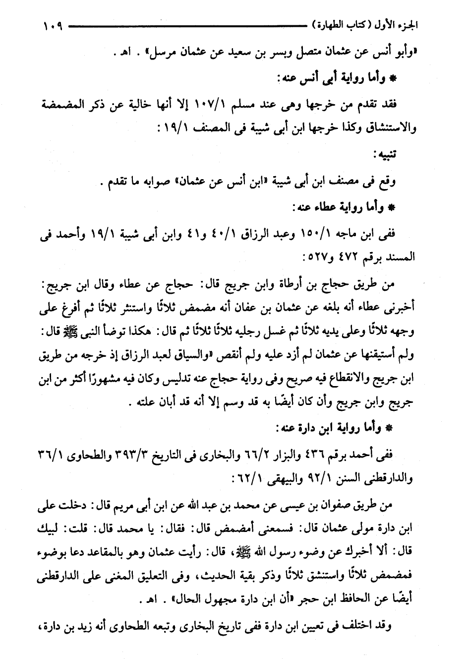 من طريق صفوان بن عشى عن محمد بن عبد الله عن ابن أبى مريم قال: دخلت على ابن دارة مولى عثمان قال: فسمعنى أمضمض قال: فقال: يا محمد قال: قلت: لبيك قال: ألا أخبرك عن وضوء رسول الله - صلى الله عليه وسلم -، قال: رأيت عثمان وهو بالمقاعد دعا بوضوء فمضمض ثلاثًا واستنشق ثلاثًا وذكر بقية الحديث، وفى التعليق المغنى على الدارقطني أيضًا عن الحافظ ابن حجر "أن ابن دارة مجهول الحال". اهـ.