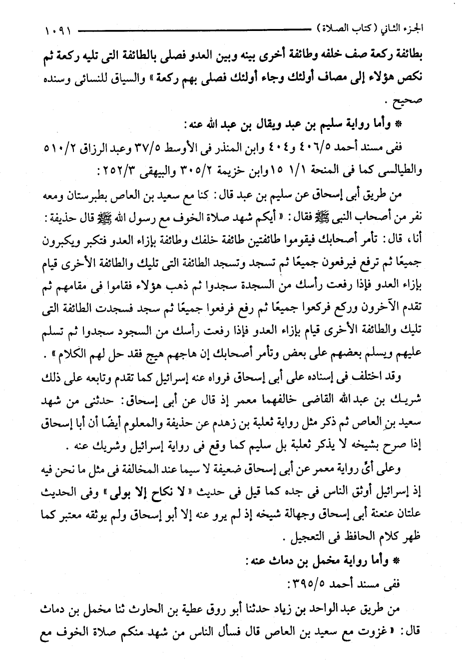 من طريق أبي إسحاق عن سليم بن عبد قال: كنا مع سعيد بن العاص بطبرستان ومعه نفر من أصحاب النبي - صلى الله عليه وسلم - فقال: "أيكم شهد صلاة الخوف مع رسول الله - صلى الله عليه وسلم - قال حذيفة: أنا، قال: تأمر أصحابك فيقوموا طائفتين طائفة خلفك وطائفة بإزاء العدو فتكبر ويكبرون جميعًا ثم ترفع فيرفعون جميعًا ثم تسجد وتسجد الطائفة التى تليك والطائفة الأخرى قيام بإزاء العدو فإذا رفعت رأسك من السجدة سجدوا ثم ذهب هؤلاء فقاموا في مقامهم ثم تقدم الآخرون وركع فركعوا جميعًا ثم رفع فرفعوا جميعًا ثم سجد فسجدت الطائفة التي تليك والطائفة الأخرى قيام بإزاء العدو فإذا رفعت رأسك من السجود سجدوا ثم تسلم عليهم ويسلم بعضهم على بعض وتأمر أصحابك إن هاجهم هيج فقد حل لهم الكلام". وقد اختلف في إسناده على أبي إسحاق فرواه عنه إسرائيل كما تقدم وتابعه على ذلك شريك بن عبد الله القاضي خالفهما معمر إذ قال عن أبي إسحاق: حدثني من شهد سعيد بن العاص ثم ذكر مثل رواية ثعلبة بن زهدم عن حذيفة والمعلوم أيضًا أن أبا إسحاق إذا صرح بشيخه لا يذكر ثعلبة بل سليم كما وقع في رواية إسرائيل وشريك عنه.