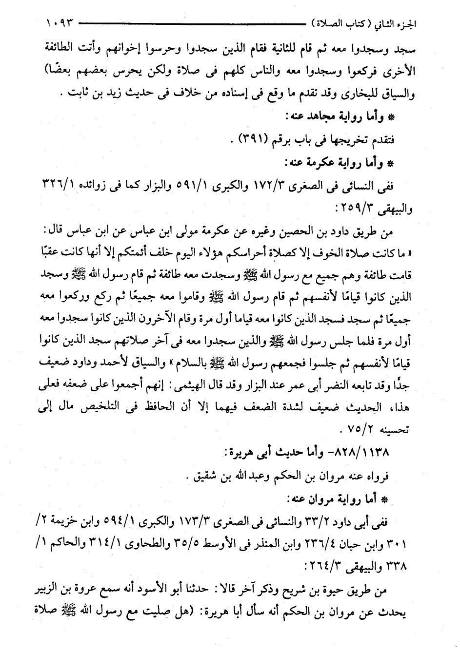 من طريق داود بن الحصين وغيره عن عكرمة مولى ابن عباس عن ابن عباس قال: "ما كانت صلاة الخوف إلا كصلاة أحراسكم هؤلاء اليوم خلف أئمتكم إلا أنها كانت عقبًا قامت طائفة وهم جميع مع رسول الله - صلى الله عليه وسلم - وسجدت معه طائفة ثم قام رسول الله - صلى الله عليه وسلم - وسجد الذين كانوا قيامًا لأنفسهم ثم قام رسول الله - صلى الله عليه وسلم - وقاموا معه جميعًا ثم ركع وركعوا معه جميعًا ثم سجد فسجد الذين كانوا معه قياما أول مرة وقام الآخرون الذين كانوا سجدوا معه أول مرة فلما جلس رسول الله - صلى الله عليه وسلم - والذين سجدوا معه في آخر صلاتهم سجد الذين كانوا قيامًا لأنفسهم ثم جلسوا فجمعهم رسول الله - صلى الله عليه وسلم - بالسلام" والسياق لأحمد وداود ضعيف جدًّا وقد تابعه النضر أبي عمر عند البزار وقد قال الهيثمى: إنهم أجمعوا على ضعفه فعلى هذا، الحديث ضعيف لشدة الضعف فيهما إلا أن الحافظ في التلخيص مال إلى تحسينه 2/ 75.