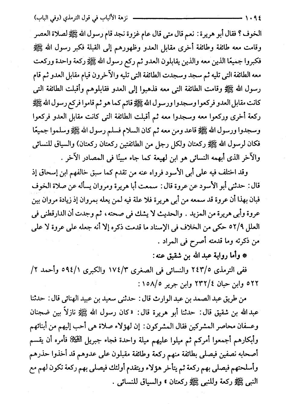 الخوف؟ فقال أبو هريرة: نعم قال متى قال عام غزوة نجد قام رسول الله - صلى الله عليه وسلم - لصلاة العصر وقامت معه طائفة وطائفة أخرى مقابل العدو وظهورهم إلى القبلة فكبر رسول الله - صلى الله عليه وسلم - فكبروا جميعًا الذين معه والذين يقابلون العدو ثم ركع رسول الله - صلى الله عليه وسلم - ركعة واحدة وركعت معه الطائفة التى تليه ثم سجد وسجدت الطائفة التى تليه والآخرون قيام مقابل العدو ثم قام رسول الله - صلى الله عليه وسلم - وقامت الطائفة التي معه فذهبوا إلى العدو فقابلوهم وأقبلت الطائفة التي كانت مقابل العدو فركعوا وسجدوا ورسول الله - صلى الله عليه وسلم - قائم كما هو ثم قاموا فركع رسول الله - صلى الله عليه وسلم - ركعة أخرى وركعوا معه وسجدوا معه ثم أقبلت الطائفة التى كانت مقابل العدو فركعوا وسجدوا ورسول الله - صلى الله عليه وسلم - قاعد ومن معه ثم كان السلام فسلم رسول الله - صلى الله عليه وسلم - وسلموا جميعًا فكان لرسول الله - صلى الله عليه وسلم - ركعتان ولكل رجل من الطائفتين ركعتان ركعتان) والسياق للنسائي والآخر الذى أبهمه النسائي هو ابن لهيعة كما جاء مبينًا في المصادر الآخر.