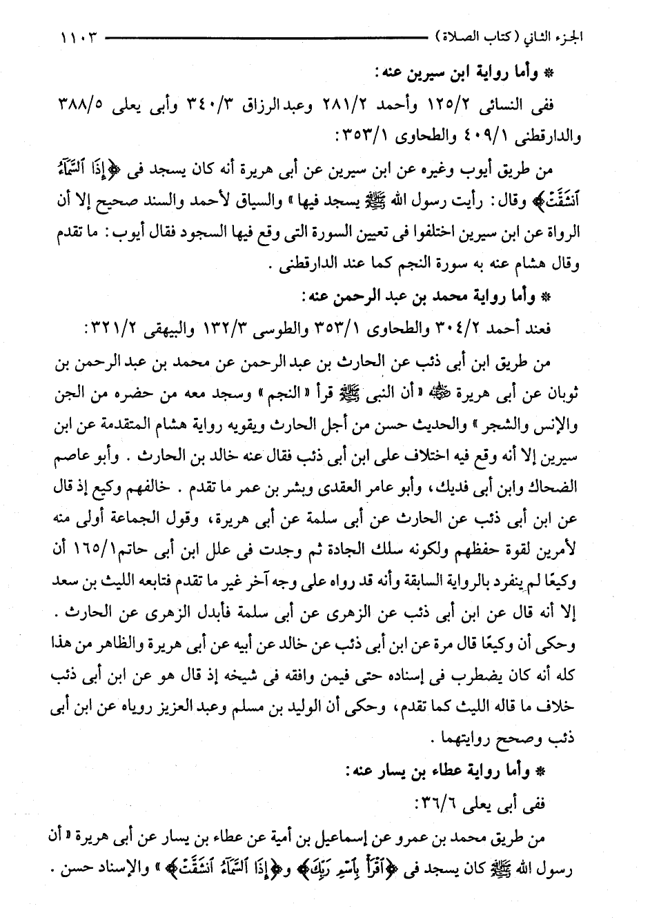 من طريق أيوب وغيره عن ابن سيرين عن أبي هريرة أنه كان يسجد في {إِذَا السَّمَاءُ انْشَقَّتْ} وقال: رأيت رسول الله - صلى الله عليه وسلم - يسجد فيها" والسياق لأحمد والسند صحيح إلا أن الرواة عن ابن سيرين اختلفوا في تعيين السورة التى وقع فيها السجود فقال أيوب: ما تقدم وقال هشام عنه به سورة النجم كما عند الدارقطني.