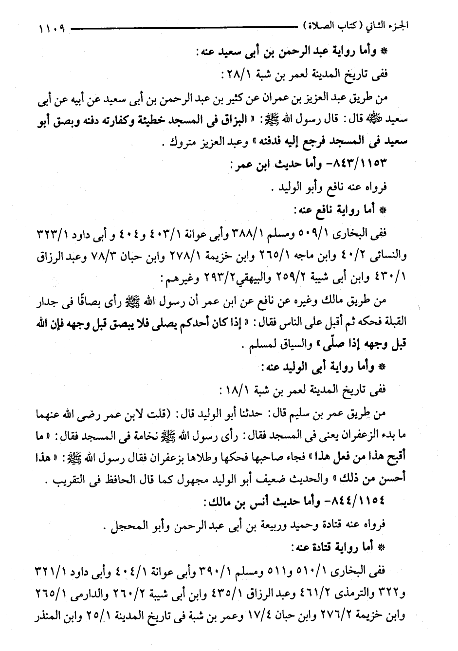 من طريق عمر بن سليم قال: حدثنا أبو الوليد قال: (قلت لابن عمر رضى الله عنهما ما بدء الزعفران يعنى في المسجد فقال: رأى رسول الله - صلى الله عليه وسلم - نخامة في المسجد فقال: "ما أقبح هذا من فعل هذا" فجاء صاحبها فحكها وطلاها بزعفران فقال رسول الله - صلى الله عليه وسلم -: "هذا أحسن من ذلك" والحديث ضعيف أبو الوليد مجهول كما قال الحافظ في التقريب. 1154/ 844 - وأما حديث أنس بن مالك: