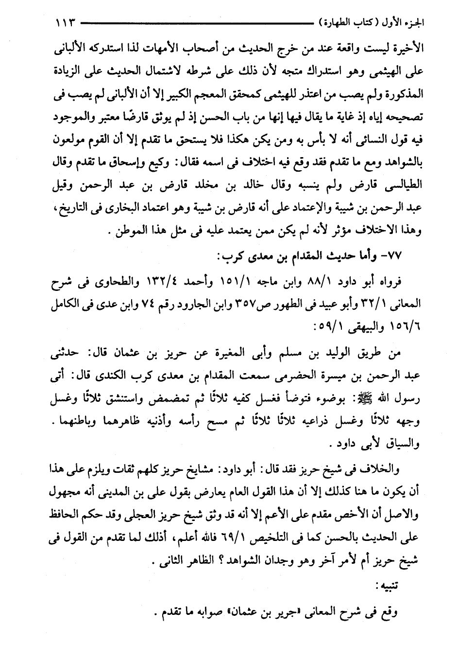 والخلاف في شيخ حريز فقد قال: أبو داود: مشايخ حريز كلهم ثقات ويلزم على هذا أن يكون ما هنا كذلك إلا أن هذا القول العام يعارض يقول على بن المديني أنه مجهول والأصل أن الأخص مقدم على الأعم إلا أنه قد وثق شيخ حريز العجلي وقد حكم الحافظ على الحديث بالحسن كما في التلخيص 1/ 69 فالله أعلم، أذلك لما تقدم من القول في شيخ حريز أم لأمر آخر وهو وجدان الشواهد؟ الظاهر الثانى.