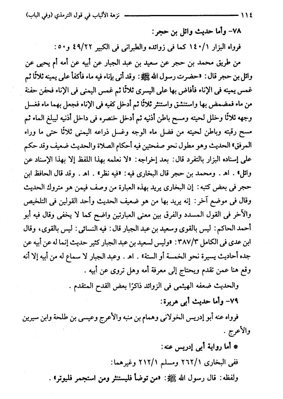 من طريق محمد بن حجر عن سعيد بن عبد الجبار عن أبيه عن أمه أم يحيى عن وائل بن حجر قال: "حضرت رسول الله - صلى الله عليه وسلم -: وقد أتى بإناء فيه ماء فأكفأ على يمينه ثلاثًا ثم غمس يمينه في الإناء فأفاض بها على اليسرى ثلاثًا ثم غمس المنى في الإناء فحفن حفنة من ماء فمضمض بها واستنشق واستنثر ثلاثًا ثم أدخل كفيه في الإناء فجعل بهما ماء فغسل وجهه ثلاثًا وخلل لحيته ومسح باطن أذنيه ثم أدخل خنصره في داخل أذنيه ليبلغ الماء ثم مسح رقبته وباطن لحيته من فضل ماء الوجه وغسل ذراعه اليمنى ثلاثًا حتى ما وراء المرفق" الحديث وهو مطول نحو صفحتين فيه أحكام الصلاة والحديث ضعيف وقد حكم على إسناده البزار بالتفرد قال: بعد إخراجه: "لا نعلمه بهذا اللفظ إلا بهذا الإسناد عن وائل". اهـ. ومحمد بن حجر قال البخاري فيه: "فيه نظر". اهـ. وقد قال الحافظ ابن حجر في بعض كتبه: إن البخاري يريد بهذه العبارة من وصف فيمن هو متروك الحديث وقال في موضع آخر: إنه يريد بها من هو ضعيف الحديث وأحد القولين في التلخيص والآخر في القول المسدد والفرق بين معنى العبارتين واضح كما لا يخفى وقال فيه أبو أحمد الحاكم: ليس بالقوى وسعيد بن عبد الجبار قال: فيه النسائي: ليس بالقوى، وقال ابن على في الكامل 3/ 387: "وليس لسعيد بن عبد الجبار كثير حديث إنما له عن أبيه عن جده أحاديث يسيرة نحو الخمسة أو الستة". اهـ. وعبد الجبار لا سماع له من أبيه إلا أنه وقع هنا عمن تقدم ويحتاج إلى معرفة أمه وهل تروى عن أبيه.