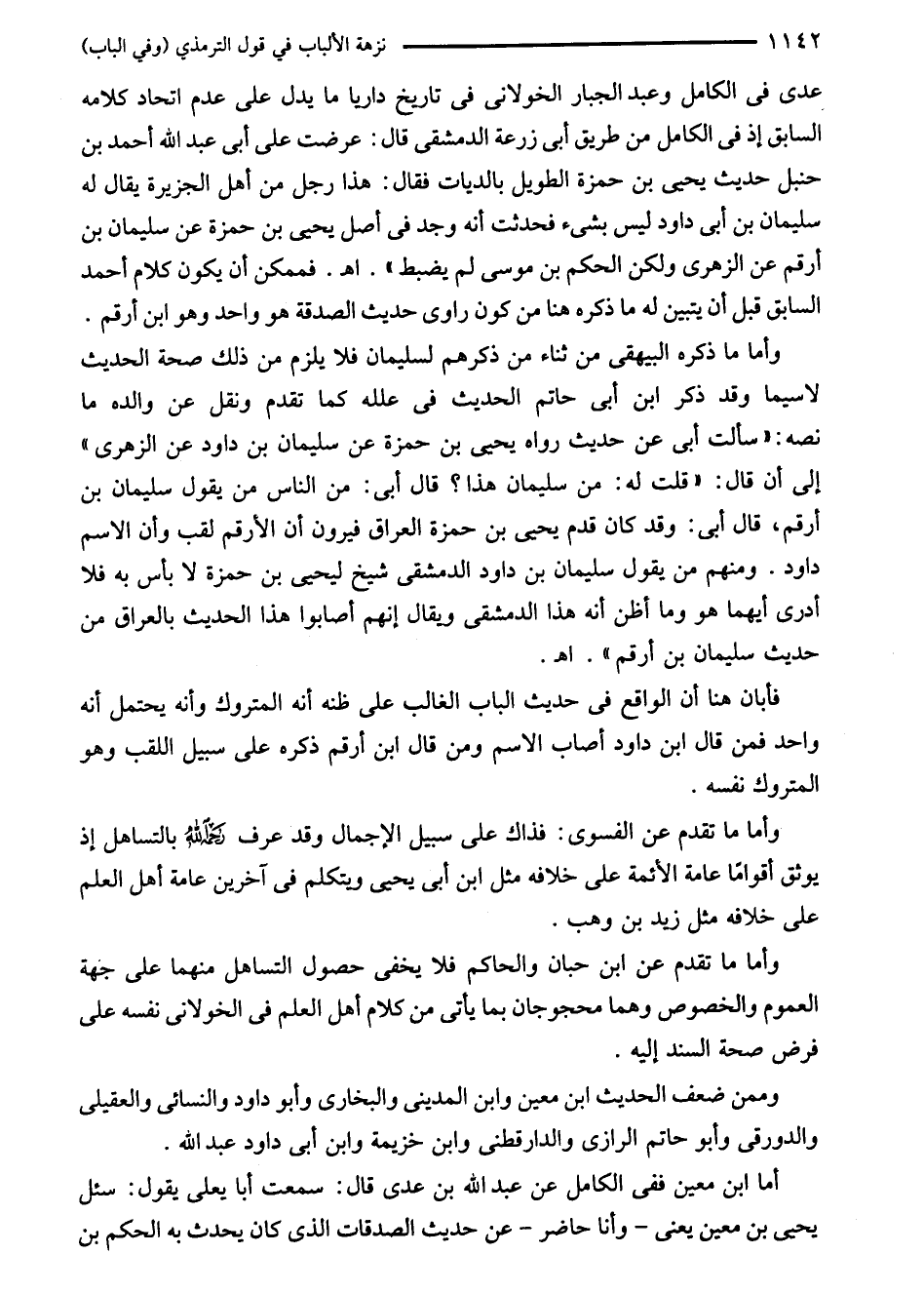 وأما ما ذكره البيهقي من ثناء من ذكرهم لسليمان فلا يلزم من ذلك صحة الحديث لا سيما وقد ذكر ابن أبي حاتم الحديث في علله كما تقدم ونقل عن والده ما نصه: "سألت أبي عن حديث رواه يحيى بن حمزة عن سليمان بن داود عن الزهري" إلى أن قال: "قلت له: من سليمان هذا؟ قال أبي: من الناس من يقول سليمان بن أرقم، قال أبي: وقد كان قدم يحيى بن حمزة العراق فيرون أن الأرقم لقب وأن الاسم