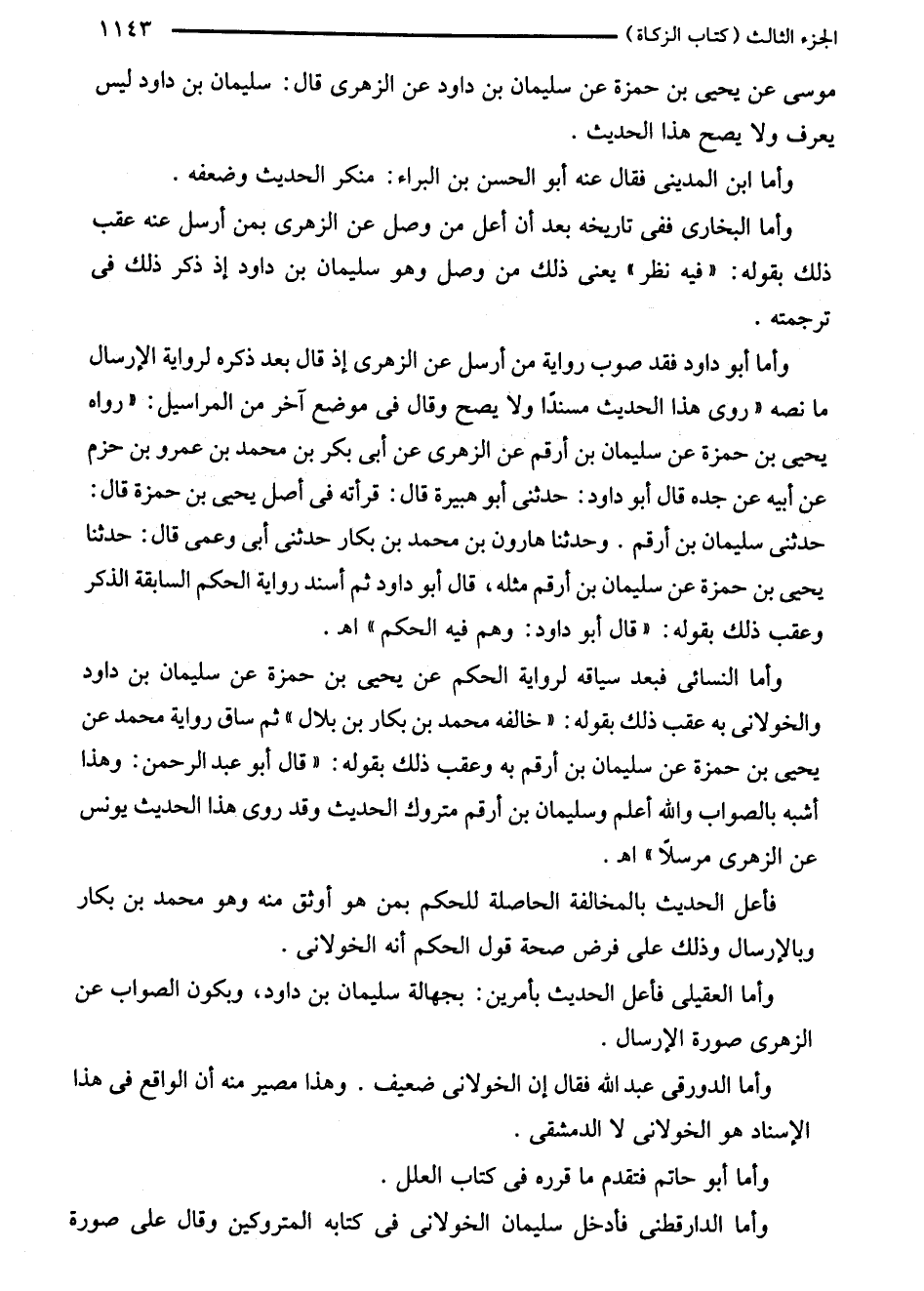 وأما أبو داود فقد صوب رواية من أرسل عن الزهري إذ قال بعد ذكره لرواية الإرسال ما نصه "روى هذا الحديث مسندًا ولا يصح وقال في موضع آخر من المراسيل: "رواه يحيى بن حمزة عن سليمان بن أرقم عن الزهري عن أبي بكر بن محمد بن عمرو بن حزم عن أبيه عن جده قال أبو داود: حدثني أبو هبيرة قال: قرأته في أصل يحيى بن حمزة قال: حدثني سليمان بن أرقم. وحدثنا هارون بن محمد بن بكار حدثني أبي وعمى قال: حدثنا يحيى بن حمزة عن سليمان بن أرقم مثله، قال أبو داود ثم أسند رواية الحكم السابقة الذكر وعقب ذلك بقوله: "قال أبو داود: وهم فيه الحكم" اهـ.