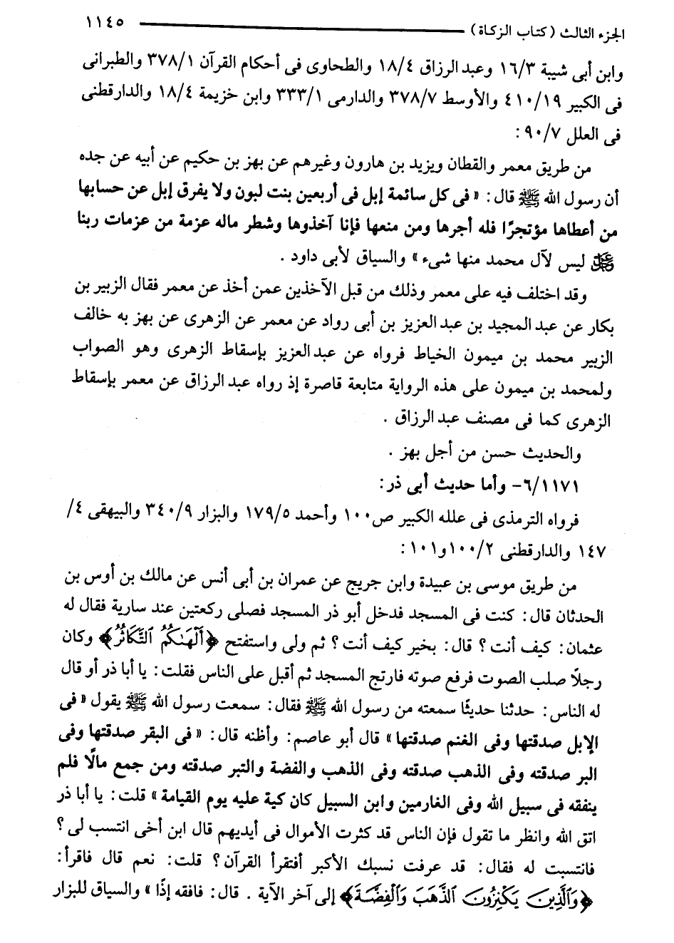 من طريق معمر والقطان ويزيد بن هارون وغيرهم عن بهز بن حكيم عن أبيه عن جده أن رسول الله - صلى الله عليه وسلم - قال: "في كل سائمة إبل في أربعين بنت لبون ولا يفرق إبل عن حسابها من أعطاها مؤتجرًا فله أجرها ومن منعها فإنا آخذوها وشطر ماله عزمة من عزمات ربنا - عز وجل - ليس لآل محمد منها شيء" والسياق لأبى داود.