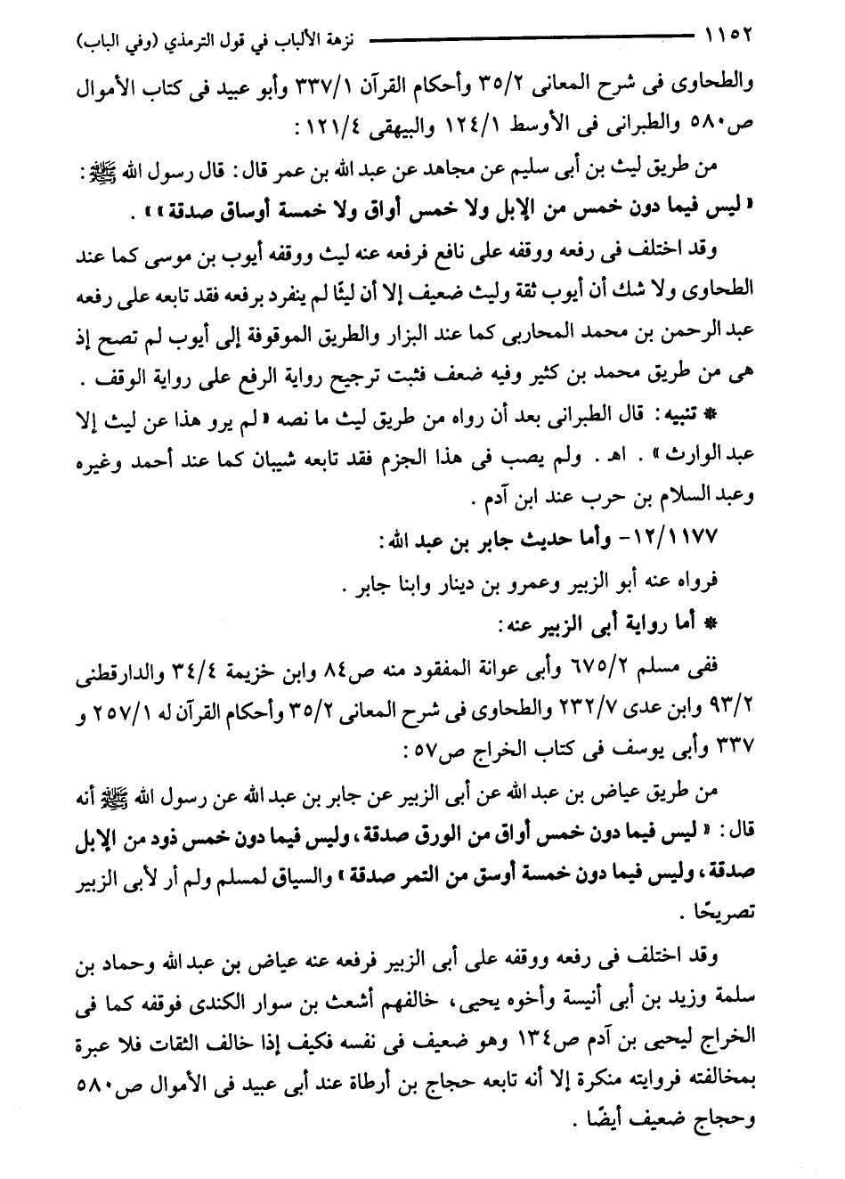من طريق ليث بن أبي سليم عن مجاهد عن عبد الله بن عمر قال: قال رسول الله - صلى الله عليه وسلم -: "ليس فيما دون خمس من الإبل ولا خمس أواق ولا خمسة أوساق صدقة"".