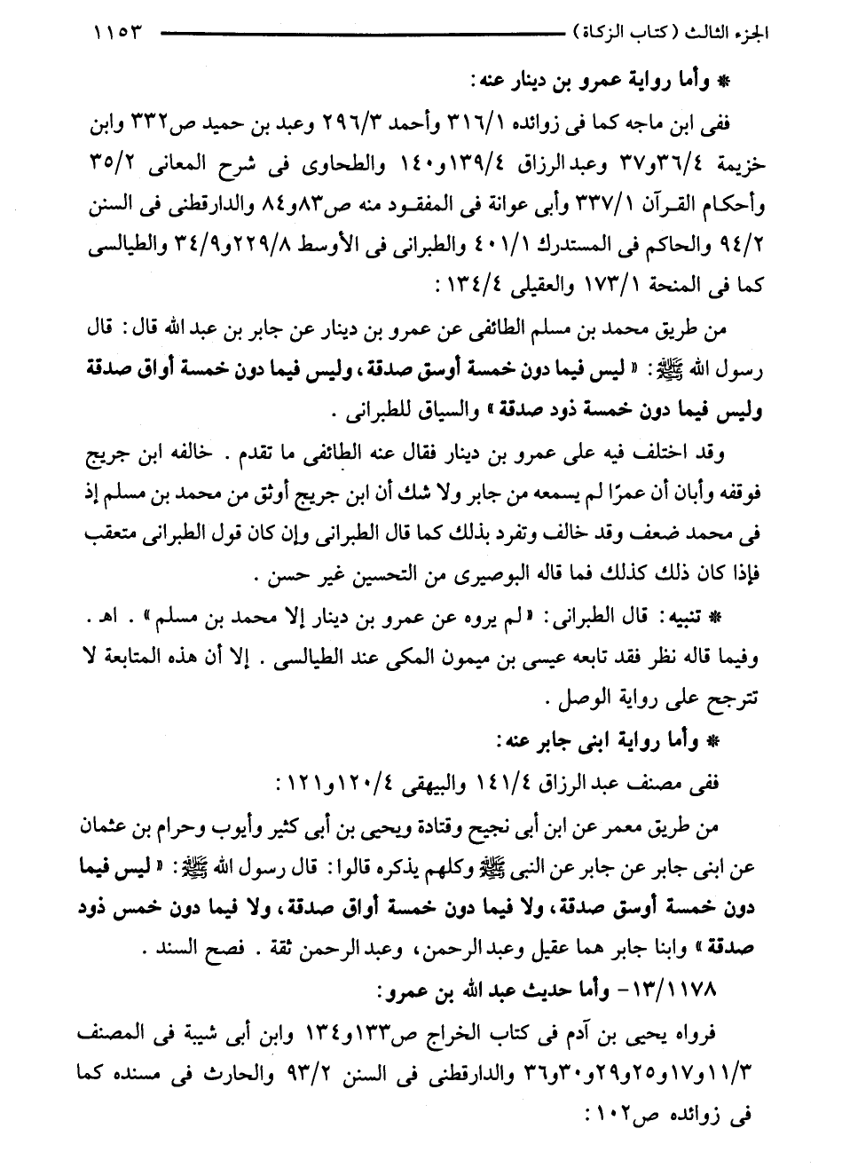 من طريق محمد بن مسلم الطائفى عن عمرو بن دينار عن جابر بن عبد الله قال: قال رسول الله - صلى الله عليه وسلم -: "ليس فيما دون خمسة أوسق صدقة، وليس فيما دون خمسة أواق صدقة وليس فيما دون خمسة ذود صدقة" والسياق للطبراني.