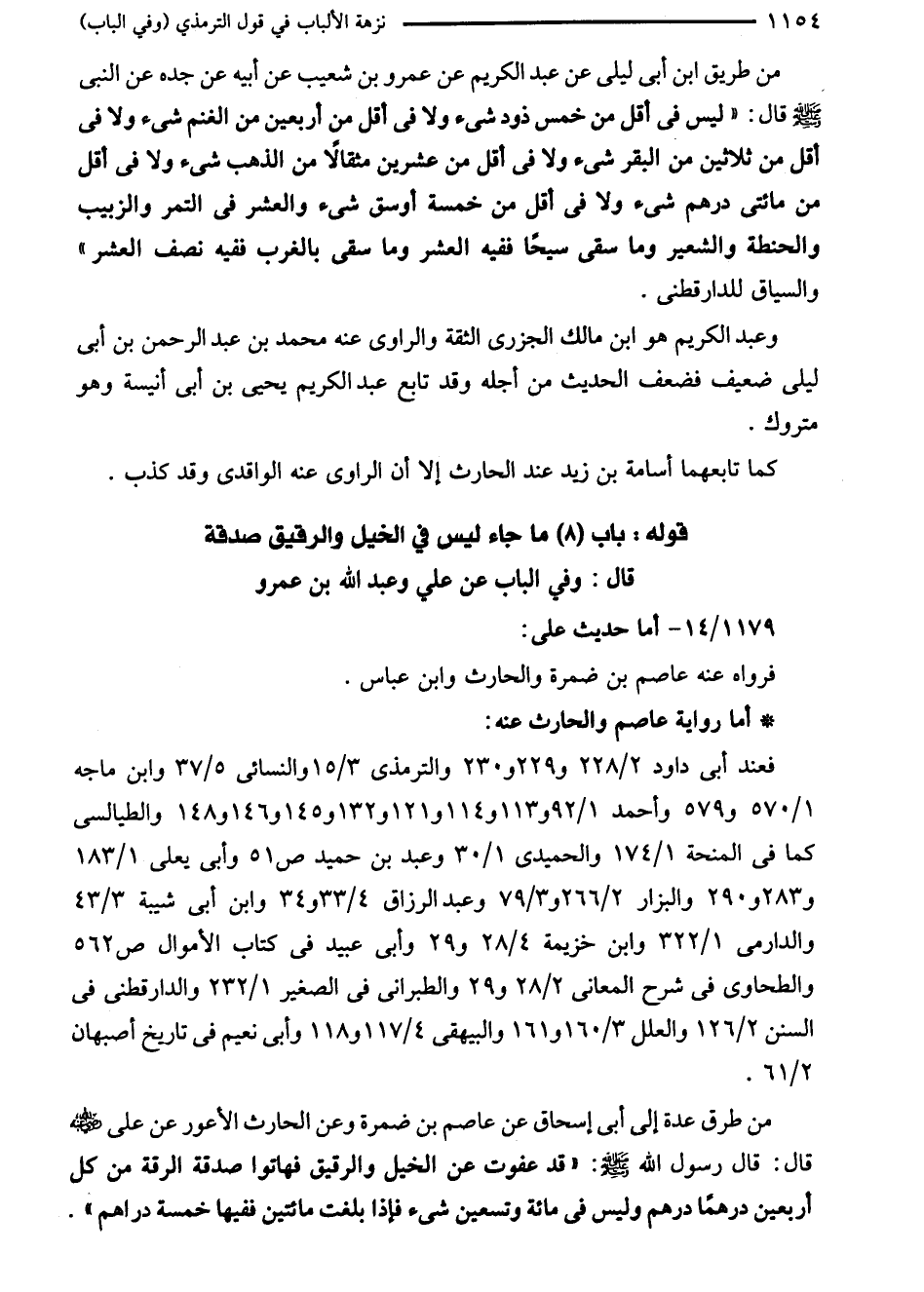 من طرق عدة إلى أبي إسحاق عن عاصم بن ضمرة وعن الحارث الأعور عن على - رضي الله عنه - قال: قال رسول الله - صلى الله عليه وسلم -: "قد عفوت عن الخيل والرقيق فهاتوا صدقة الرقة من كل أربعين درهمًا درهم وليس في مائة وتسعين شيء فإذا بلغت مائتين ففيها خمسة دراهم".