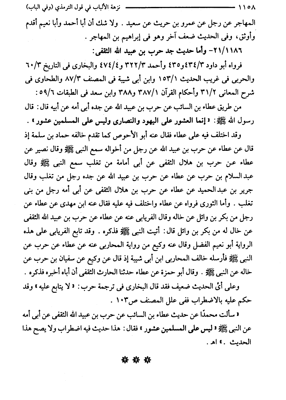 فرواه أبو داود 3/ 434 و 435 وأحمد 3/ 322 و 4/ 474 والبخاري في التاريخ 3/ 60 والحربى في غريب الحديث 1/ 153 وابن أبي شيبة في المصنف 3/ 87 والطحاوي في شرح المعاني 2/ 31 وأحكام القرآن 1/ 387 و 388 وابن سعد في الطبقات 6/ 59: من طريق عطاء بن السائب عن حرب بن عبيد الله عن جده أبي أمه عن أبيه قال: قال رسول الله - صلى الله عليه وسلم -: "إنما العشور على اليهود والنصارى وليس على المسلمين عشور".