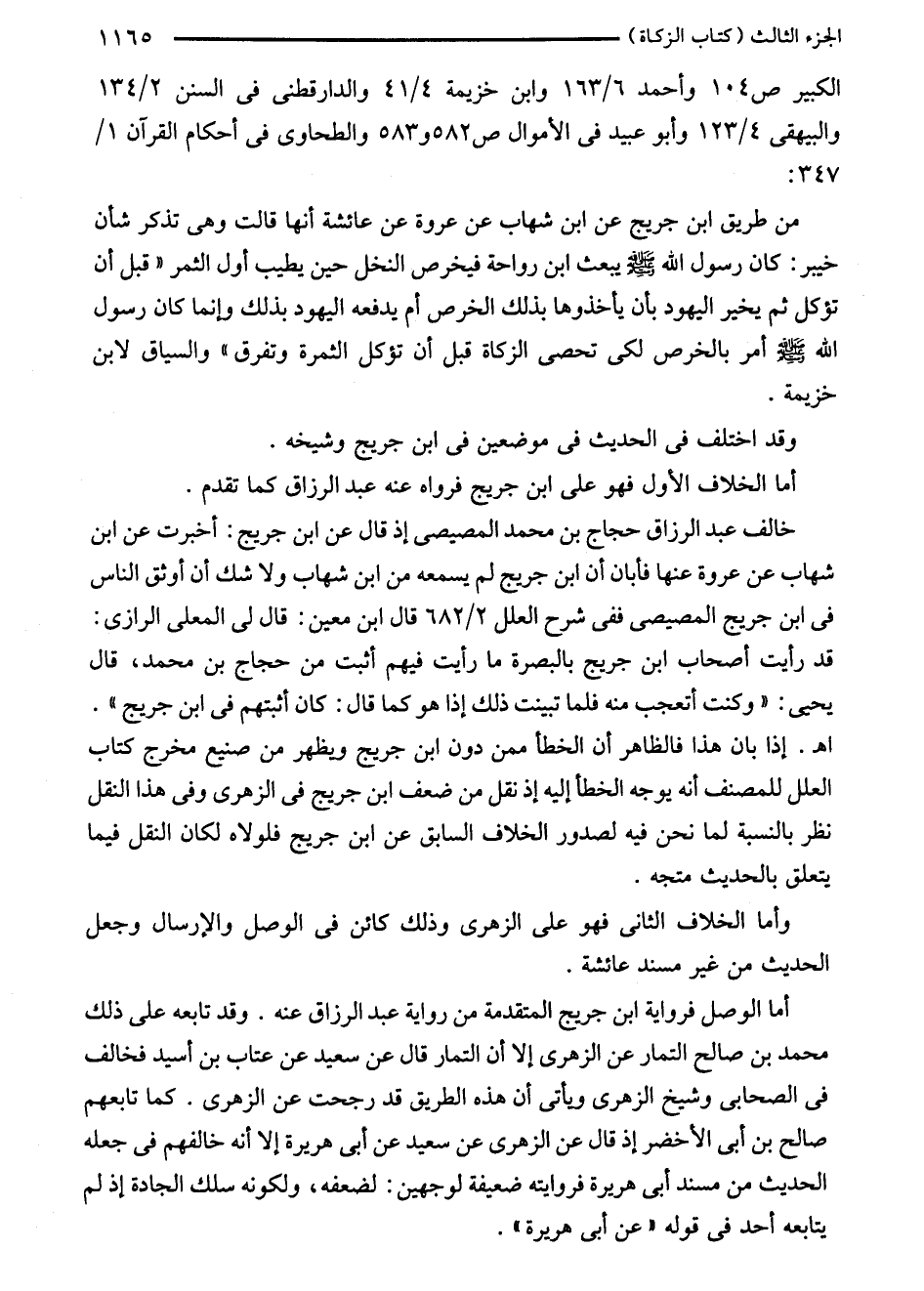 خالف عبد الرزاق حجاج بن محمد المصيصى إذ قال عن ابن جريج: أخبرت عن ابن شهاب عن عروة عنها فأبان أن ابن جريج لم يسمعه من ابن شهاب ولا شك أن أوثق الناس في ابن جريج المصيصى ففي شرح العلل 2/ 682 قال ابن معين: قال لى المعلى الرازى: قد رأيت أصحاب ابن جريج بالبصرة ما رأيت فيهم أثبت من حجاج بن محمد، قال يحيى: "وكنت أتعجب منه فلما تبينت ذلك إذا هو كما قال: كان أثبتهم في ابن جريج". اهـ. إذا بان هذا فالظاهر أن الخطأ ممن دون ابن جريج ويظهر من صنيع مخرج كتاب العلل للمصنف أنه يوجه الخطأ إليه إذ نقل من ضعف ابن جريج في الزهري وفي هذا النقل نظر بالنسبة لما نحن فيه لصدور الخلاف السابق عن ابن جريج فلولاه لكان النقل فيما يتعلق بالحديث متجه.