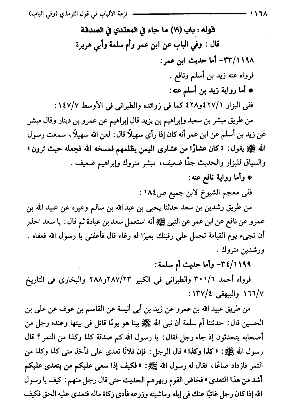 من طريق عبيد الله بن عمرو عن زيد بن أبى أنيسة عن القاسم بن عوف عن على بن الحسين قال: حدثتنا أم سلمة أن نبى الله - صلى الله عليه وسلم - بينا هو يومًا قائل في بيتها وعنده رجل من أصحابه يتحدثون إذ جاء رجل فقال: يا رسول الله كم صدقة كذا وكذا من التمر؟ قال رسول الله - صلى الله عليه وسلم -: " كذا وكذا " قال الرجل: فإن فلانًا تعدى على فأخذ منى كذا وكذا من التمر فازداد صاعًا، فقال له رسول الله - صلى الله عليه وسلم -: " فكيف إذا سعى عليكم من يتعدى عليكم أشد من هذا التعدى " فخاض القوم وبهرهم الحديث حتى قال رجل منهم: كيف يا رسول الله إذا كان رجل غائبًا عنك في إبله وماشيته وزرعه فأدى زكاة ماله فتعدى عليه الحق فكيف