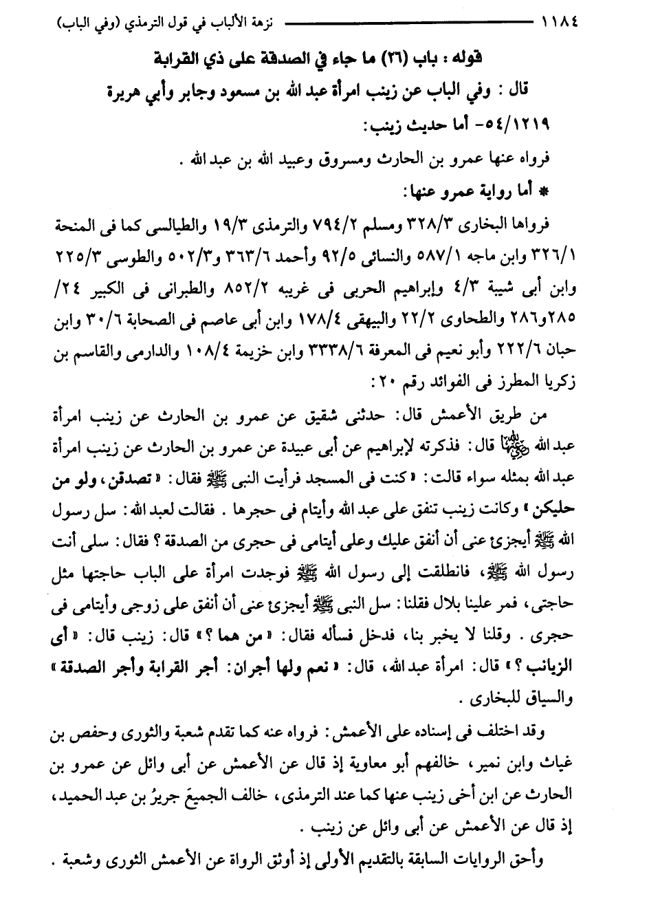 من طريق الأعمش قال: حدثنى شقيق عن عمرو بن الحارث عن زينب امرأة عبد الله - رضي الله عنها - قال: فذكرته لإبراهيم عن أبى عبيدة عن عمرو بن الحارث عن زينب امرأة عبد الله بمثله سواء قالت: "كنت في المسجد فرأيت النبي - صلى الله عليه وسلم - فقال: "تصدقن، ولو من حليكن" وكانت زينب تنفق على عبد الله وأيتام في حجرها. فقالت لعبد الله: سل رسول الله - صلى الله عليه وسلم - أيجزئ عنى أن أنفق عليك وعلى أيتامى في حجرى من الصدقة؟ فقال: سلى أنت رسول الله - صلى الله عليه وسلم -، فانطلقت إلى رسول الله - صلى الله عليه وسلم - فوجدت امرأة على الباب حاجتها مثل حاجتى، فمر علينا بلال فقلنا: سل النبي - صلى الله عليه وسلم - أيجزئ عنى أن أنفق على زوجى وأيتامى في حجرى. وقلنا لا يخبر بنا، فدخل فسأله فقال: "من هما؟ " قال: زينب قال: "أي الزيانب؟ " قال: امرأة عبد الله، قال: "نعم ولها أجران: أجر القرابة وأجر الصدقة" والسياق للبخاري.