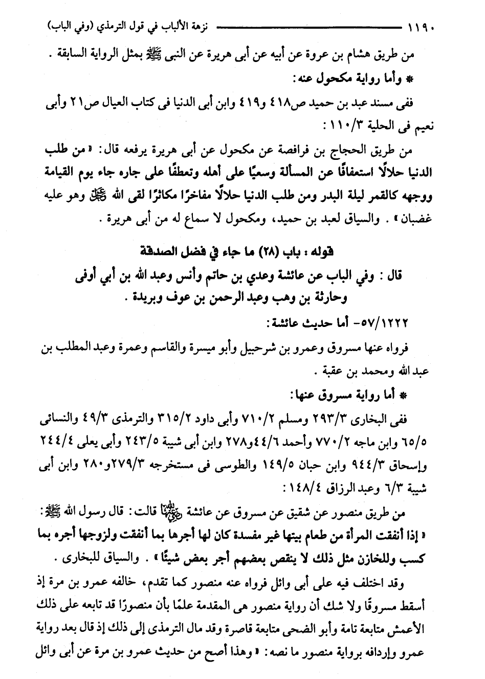 قال: وفي الباب عن عائشة وعدي بن حاتم وأنس وعبد الله بن أبي أوفى وحارثة بن وهب وعبد الرحمن بن عوف وبريدة.
