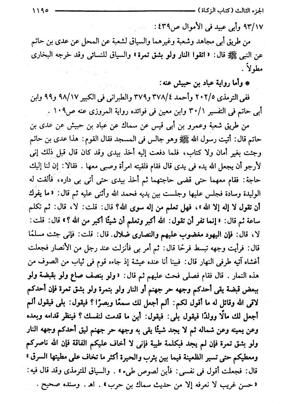 من طريق شعبة وعمرو بن أبى قيس عن سماك عن عباد بن حبيش عن عدى بن حاتم قال: أتيت رسول الله - صلى الله عليه وسلم - وهو جالس في المسجد فقال القوم: هذا عدى بن حاتم وجئت بغير أمان ولا كتاب، فلما دفعت إليه أخذ بيدى وقد كان قال قبل ذلك إنى لأرجو أن يجعل الله يده في يدى قال فقام فلقيته امرأة وصبى معها. فقالا: إن لنا إليك حاجة: فقام معهما حتى قضى حاجتهما ثم أخذ بيدى حتى أتى بى داوه، فألقت له الوليدة وسادة فجلس عليها وجلست بين يديه فحمد الله وأثنى عليه ثم قال: "ما يفرك أن تقول لا إله إلا الله"، فهل تعلم من إله سوى الله؟ قال: قلت: لا، قال: ثم تكلم ساعة ثم قال: "إنما تفر أن تقول: الله أكبر وتعلم أن شيئًا أكبر من الله؟ " قال: قلت: لا، قال: فإن اليهود مغضوب عليهم والنصارى ضلال. قال: قلت: فإنى جئت مسلمًا قال: فرأيت وجهه تبسط فرحًا قال: ثم أمر بى فأنزلت عند رجل من الأنصار فجعلت أغشاه آتيه طرفى النهار قال: فبينا أنا عنده عيشة إذ جاءه قوم في ثياب من الصوف من هذه النمار. قال فقام فصلى فحث عليهم ثم قال: "ولو بنصف صاع ولو بقبضة ولو ببعض قبضة يقى أحدكم وجهه حر جهنم أو النار ولو بتمرة ولو بشق تمرة فإن أحدكم لاقى الله وقائل له ما أقول لكم: ألم أجعل لك سمعًا وبصرًا؟ فيقول: بلى فيقول ألم أجعل لك مالاً وولدًا فيقول بلى: فيقول: أين ما قدمت لنفسك؟ فينظر قدامه وبعده وعن يمينه وعن شماله ثم لا يجد شيئًا يقى به وجهه حر جهنم ليق أحدكم وجهه النار ولو بشق تمرة فإن لم يجد فبكلمة طيبة فإنى لا أخاف عليكم الفاقة فإن الله ناصركم ومعطيكم حتى تسير الظعينة فيما بين يثرب والحيرة أكثر ما تخاف على مطيتها السرق "قال: فجعلت أقول في نفسى: فأين لصوص طىء". والسياق للترمذي وقد قال فيه: "حسن غريب لا نعرفه إلا من حديث سماك بن حرب". اهـ. وسنده صحيح.