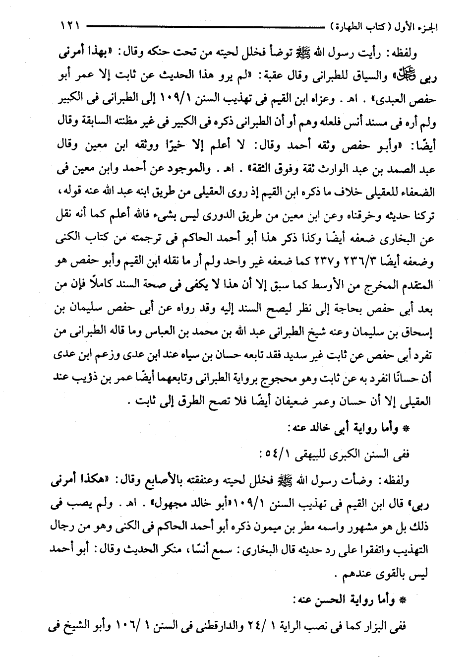 ولفظه: رأيت رسول الله - صلى الله عليه وسلم - توضأ فخلل لحيته من تحت حنكه وقال: "بهذا أمرنى ربى -عز وجل-" والسياق للطبراني وقال عقبة: "لم يرو هذا الحديث عن ثابت إلا عمر أبو حفص العبدى". اهـ. وعزاه ابن الميم في تهذيب السنن 1/ 109 إلى الطبراني في الكبير ولم أره في مسند أنس فلعله وهم أو أن الطبراني ذكره في الكبير في غير مظنته السابقة وقال أيضًا: "وأبو حفص وثقه أحمد وقال: لا أعلم إلا خيرًا ووثقه ابن معين وقال عبد الصمد بن عبد الوارث ثقة وفوق الثقة". اهـ. والموجود عن أحمد وابن معين في الضعفاء للعقيلى خلف ما ذكره ابن القيم إذ روى العقيلى من طريق ابنه عبد الله عنه قوله، تركنا حديثه وخرقناه وصت ابن معين من طريق الدورى ليس بشىء فالله أعلم كما أنه نقل عن البخاري ضعفه أيضًا وكذا ذكر هذا أبو أحمد الحاكم في ترجمته من كتاب الكنى وضعفه أيضًا 3/ 236 و 237 كما ضعفه غير واحد ولم أر ما نقله ابن القيم وأبو حفص هو المتقدم المخرج من الأوسط كما سبق إلا أن هذا لا يكفى في صحة السند كاملًا فإن من بعد أبى حفص بحاجة إلى نظر ليصح السند إليه وقد رواه عن أبى حفص سليمان بن إسحاق بن سليمان وعنه شيخ الطبراني عبد الله بن محمد بن العباس وما قاله الطبراني من تفرد أبى حفص عن ثابت غير سديد فقد تابعه حسان بن سياه عند ابن على وزعم ابن على أن حسابًا انفرد به عن ثابت وهو محجوج برواية الطبراني وتابعهما أيضًا عمر بن ذؤيب عند العقيلى إلا أن حسان وعمر ضعيفان أيضًا فلا تصح الطرق إلى ثابت.