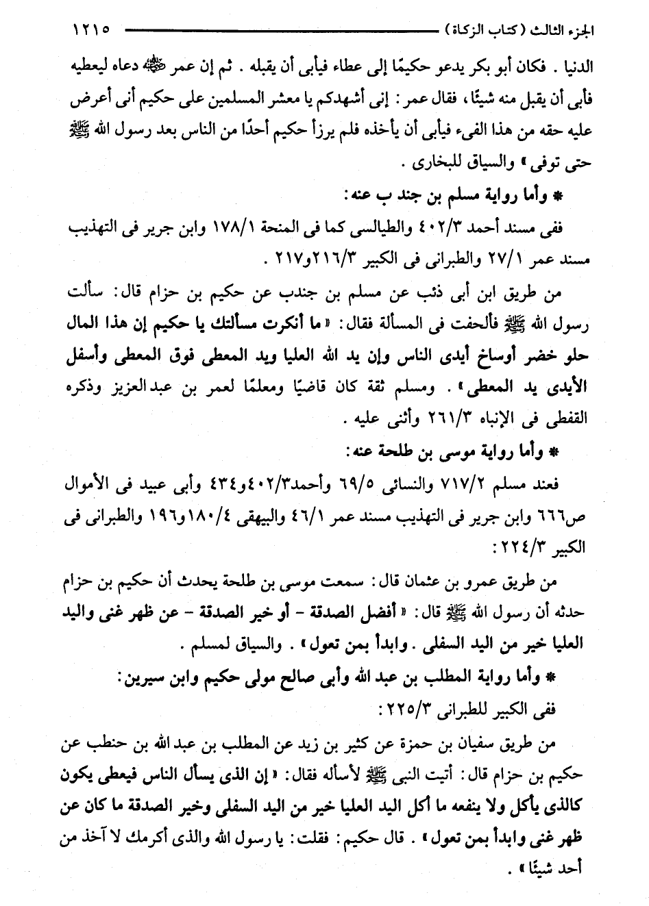 من طريق سفيان بن حمزة عن كثير بن زيد عن المطلب بن عبد الله بن حنطب عن حكيم بن حزام قال: أتيت النبي - صلى الله عليه وسلم - لأسأله فقال: "إن الذى يسأل الناس فيعطى يكون كالذى يأكل ولا ينفعه ما أكل اليد العليا خير من اليد السفلى وخير الصدقة ما كان عن ظهر غنى وابدأ بمن تعول". قال حكيم: فقلت: يا رسول الله والذى أكرمك لا آخذ من أحد شيئًا".