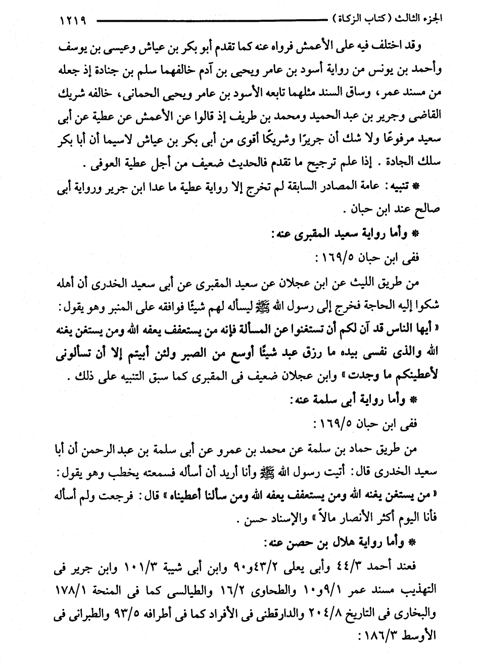 من طريق حماد بن سلمة عن محمد بن عمرو عن أبى سلمة بن عبد الرحمن أن أبا سعيد الخدرى قال: أتيت رسول الله - صلى الله عليه وسلم - وأنا أريد أن أسأله فسمعته يخطب وهو يقول: "من يستغن يغنه الله ومن يستعفف يعفه الله ومن سألنا أعطيناه" قال: فرجعت ولم أسأله فأنا اليوم أكثر الأنصار مالاً" والإسناد حسن.